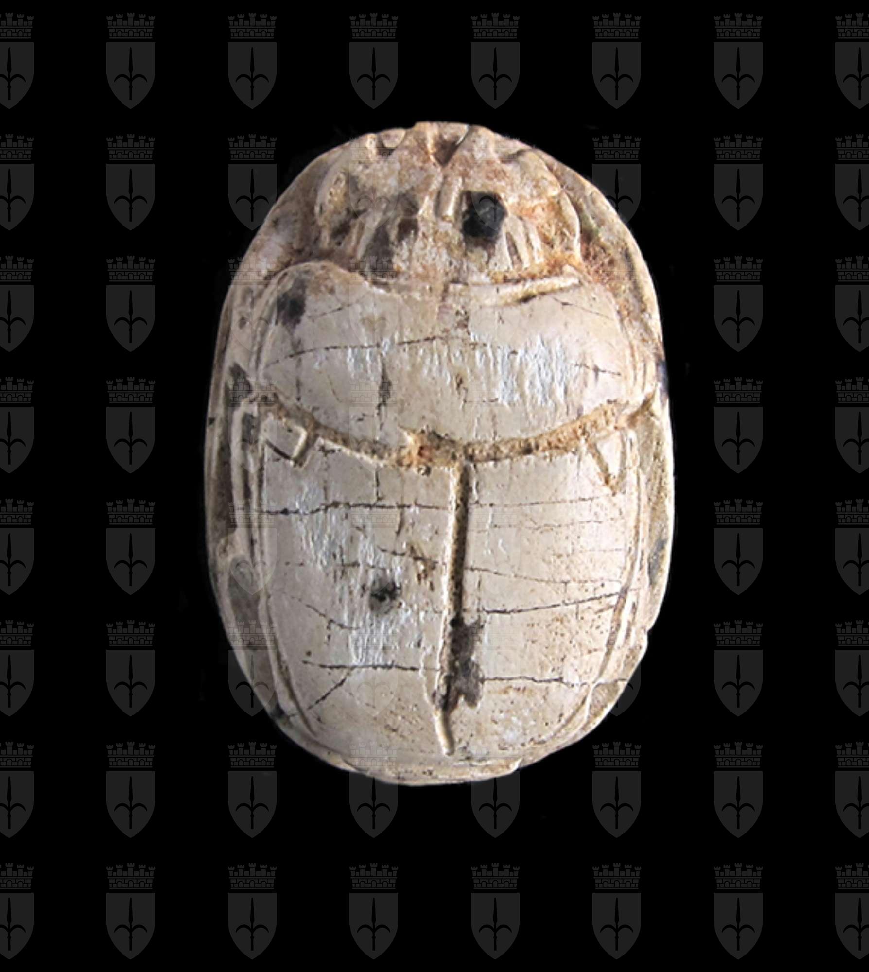 Scarabeo in steatite grigia; sul ventre incisione con segni geroglifici che costituiscono una formula non interpretabile con sicurezza. Dorso con clipeo e incisione a T che separa protorace ed elitre, le quali presentano tacche a V; sui lati si vedono le zampe ripiegate. Foro passante longitudinale.