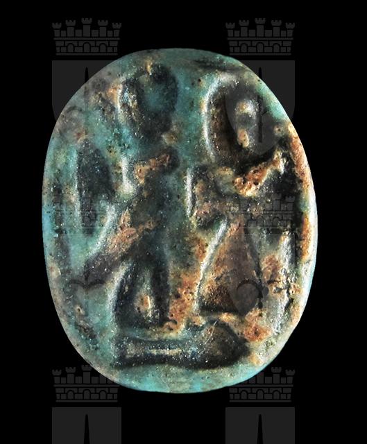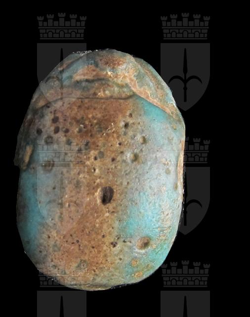 Scarabeo in steatite invetriata turchese con sul ventre incisione che rappresenta un segno ankh davanti al dio Horo in forma di falco con flagello e disco solare sulla testa. Dorso molto semplice con incisione del solo clipeo. Foro passante longitudinale.