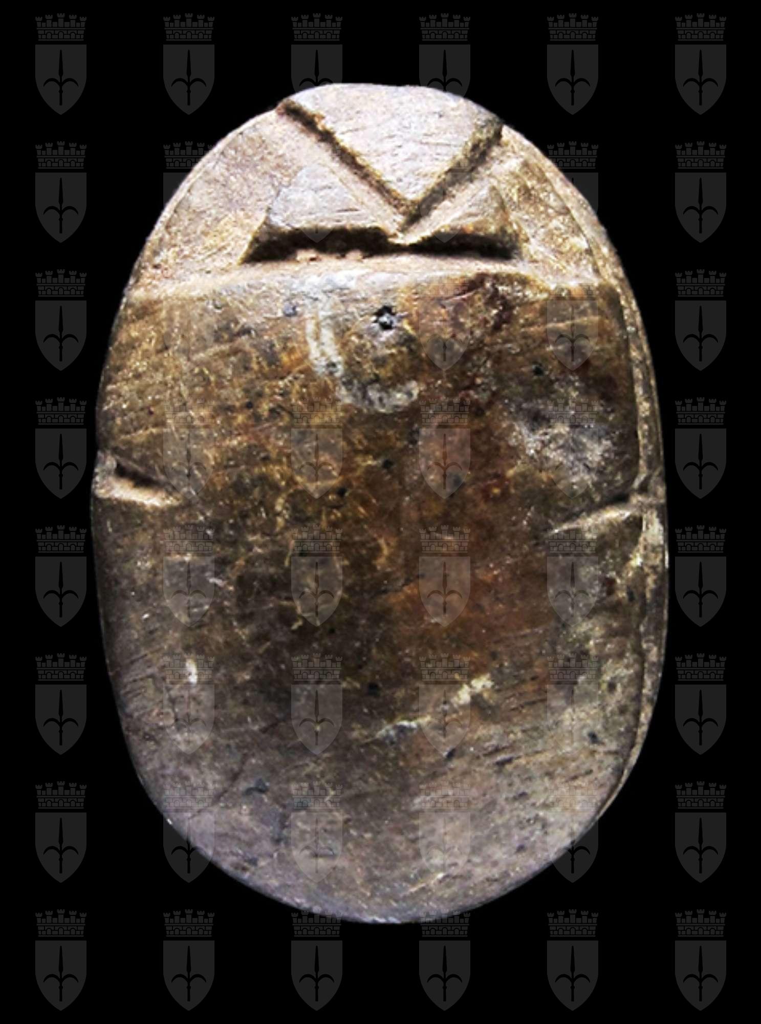 Scarabeo in steatite grigia con sul ventre una incisione, su una colonna affiancata da due segni neb, dello schema decorativo “a-n-r”. Dorso molto semplice, con incisione a V del clipeo e piccole tacche laterali all’altezza del protorace. Foro passante longitudinale.
