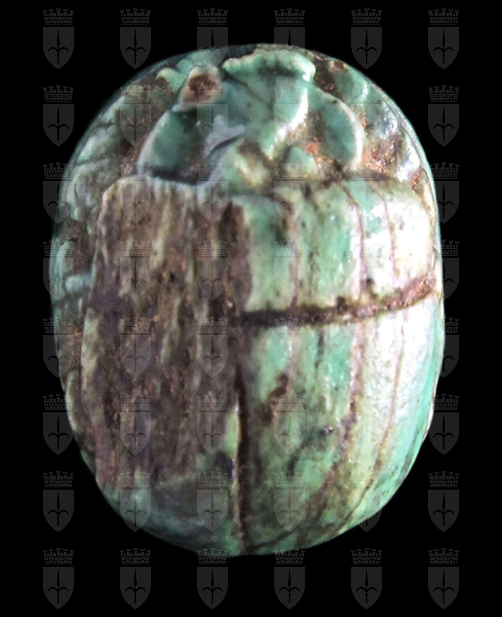 Scarabeo in steatite invetriata turchese con, sul ventre, l'incisione di due urei con le corone dell’Alto e Basso Egitto. Sebbene il dorso presenti una scheggiatura nella parte sinistra, sono comunque visibili il clipeo e la divisione tra protorace ed elitre. Foro passante longitudinale.
