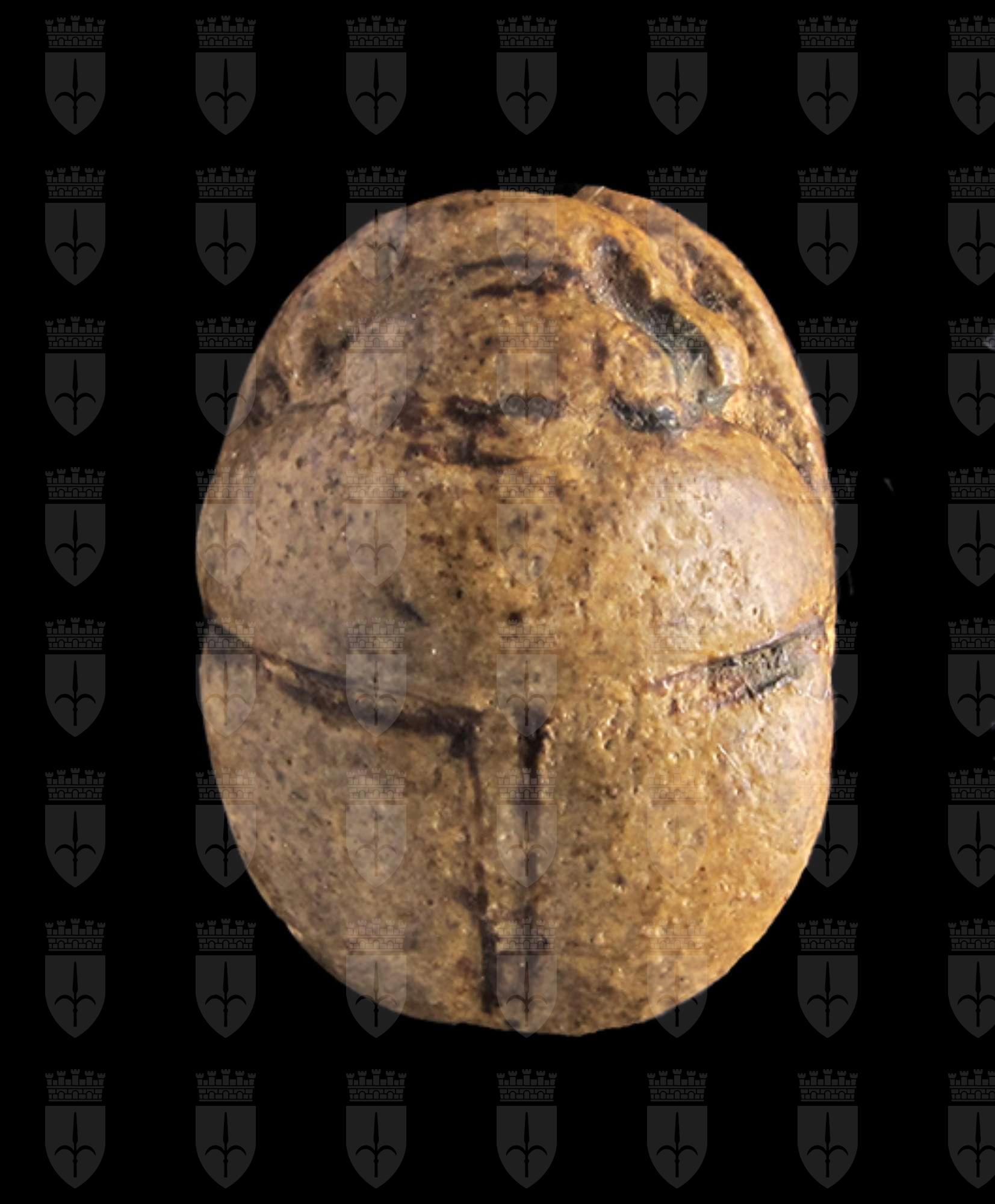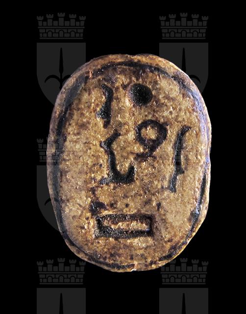 Scarabeo in steatite grigiastra con sul ventre incisione di segni geroglifici, molto consumati, all’interno di una cornice ovale; si possono interpretare come Men-maat-ra, prenome di Sethi I. Dorso con clipeo sulla testa e incisione a T che separa il protorace dalle elitre. Foro passante longitudinale.