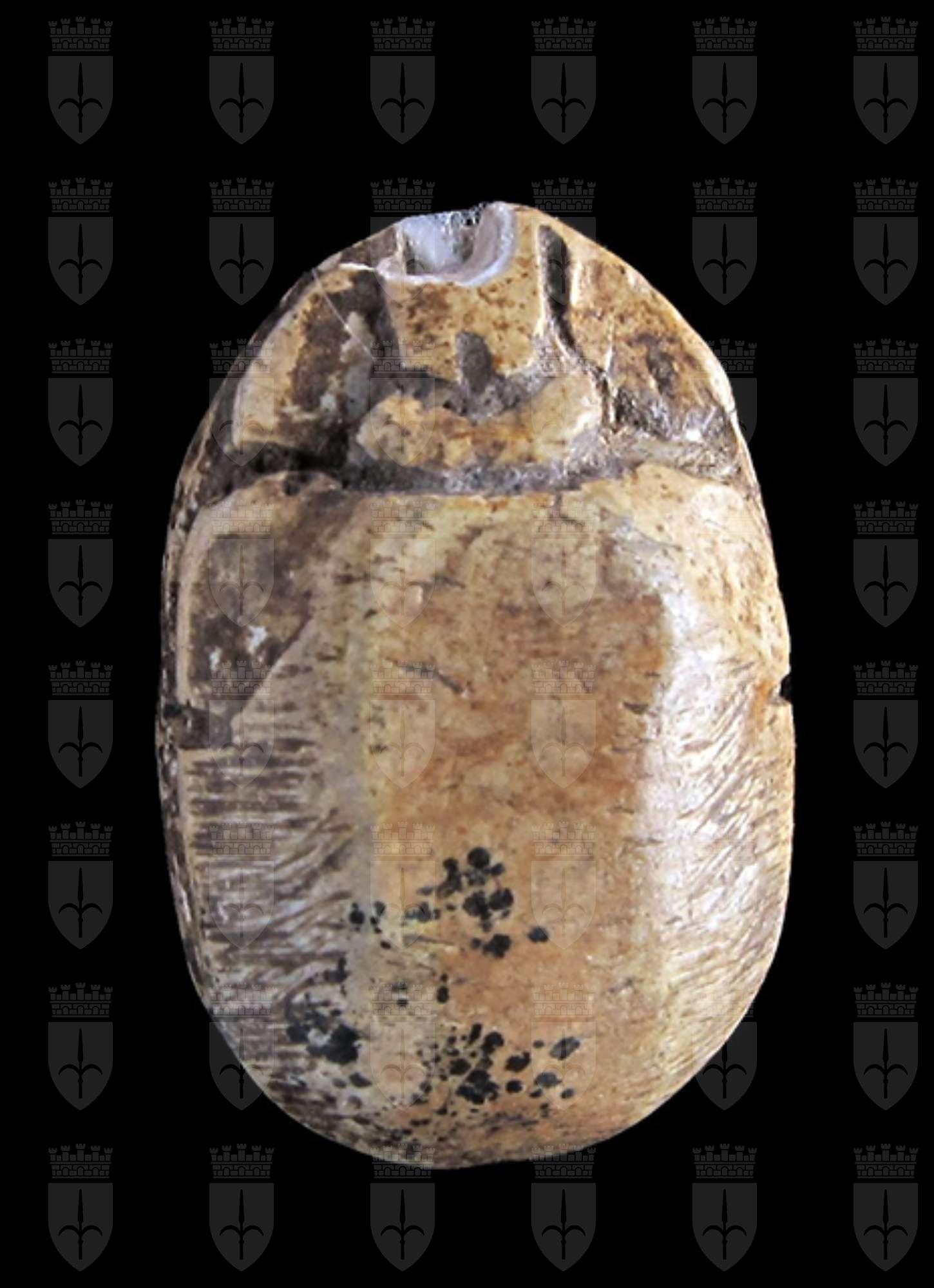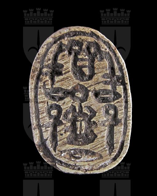 Scarabeo in steatite grigia; il ventre dello scarabeo è decorato con il prenome di Sesostri I (faraone della XII dinastia, 1994-1781 a.C.), Kheper-ka-ra, con ai lati segni geroglifici disposti simmetricamente. Dorso con semplice lavorazione del clipeo. Foro passante longitudinale.