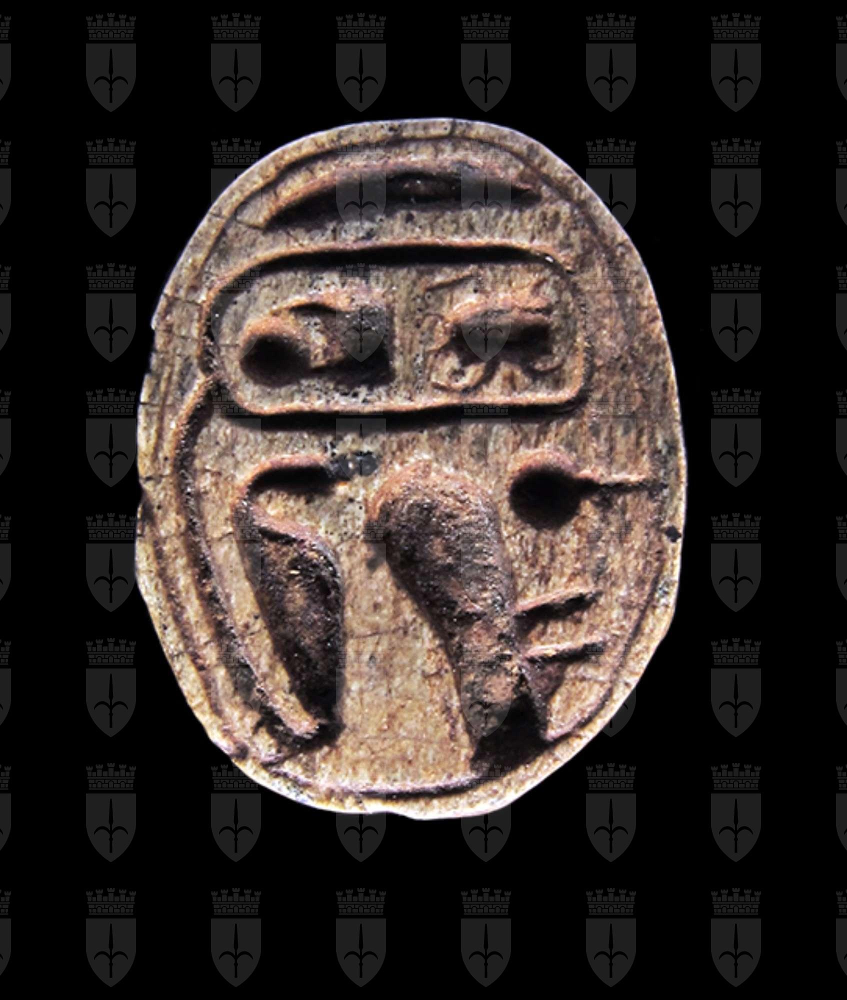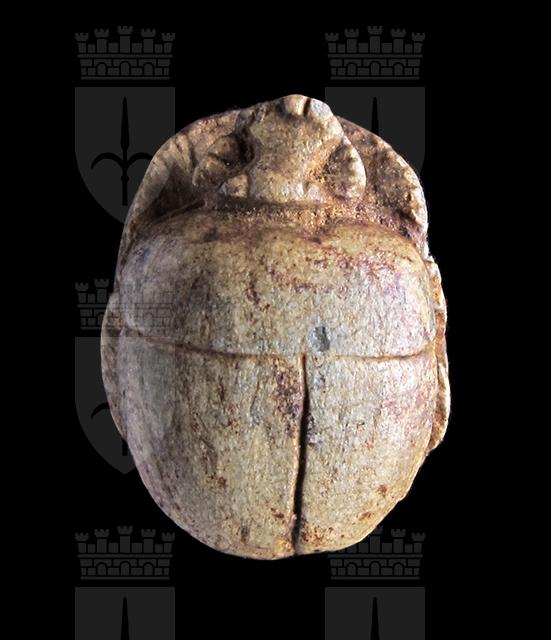 Scarabeo in steatite marrone grigiastra; sul ventre, sotto un segno neb rovesciato si vede un cartiglio col prenome di Thutmosi III in disposizione orizzontale, dal quale pende a sinistra un ureo. Davanti a questo vi sono un segno ankh ed un falco molto stilizzato disposti perpendicolarmente rispetto al resto della decorazione. Dorso con decorazioni sulla testa che contornano l’elaborato clipeo, incisione a T che separa protorace ed elitre. Foro passante longitudinale.
