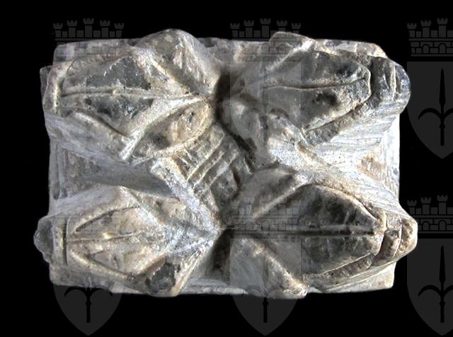 Sigillo in steatite. Su una faccia si vede il cartiglio col prenome di Thutmosi III in disposizione verticale, affiancato da due urei. Sull’altra sono raffigurate a rilievo quattro rane, simbolo di fecondità. Foro passante longitudinale.