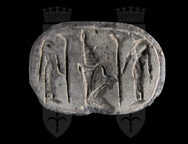 Scarabeo in steatite grigia con sul ventre una rappresentazione del faraone con la corona bianca dell’Alto Egitto genuflesso tra due divinità femminili che reggono lo scettro uag. Dorso con clipeo stilizzato, doppia divisione orizzontale tra protorace ed elitre, piccola incisione a V sopra la divisione delle elitre e tacche a V laterali. Foro passante longitudinale.