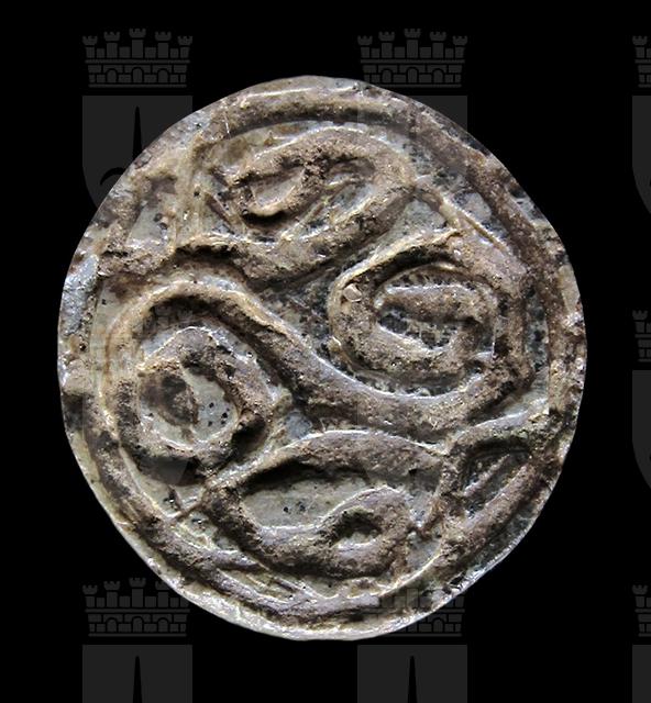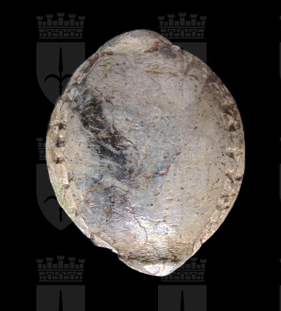 Scaraboide in steatite grigiastra con sul ventre incisione di motivo decorativo a spirale. Dorso che ricorda la forma di una conchiglia. Foro passante longitudinale.