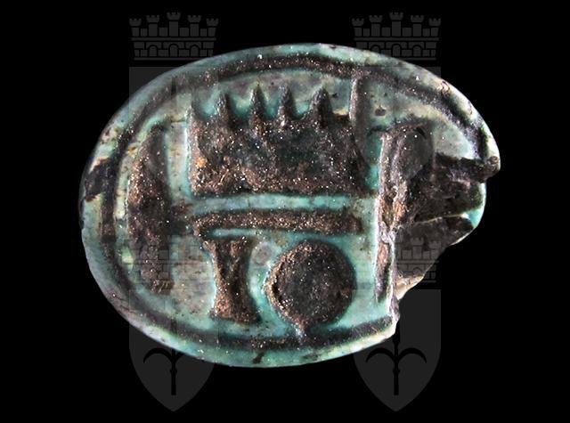 Scarabeo in steatite invetriata azzurra con sul ventre incisione del nome di Amon-Ra all’interno di un ovale, sulla sinistra un segno neb con funzione di riempitivo. Dorso con clipeo sulla testa e incisione a T che separa il protorace dalle elitre, che presentano terminazioni a “ricciolo”. Foro passante longitudinale.