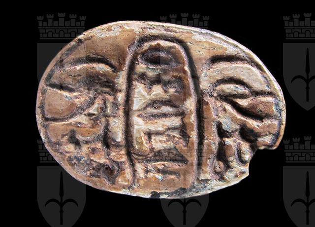 Scarabeo in steatite marrone con sul ventre incisione di un motivo molto simile a quello “a-n-r” in un cartiglio disposto verticalmente, affiancato su ciascun lato da un ugiat e due segni nefer. Dorso con clipeo, elitre e protorace non sono distinti. Foro passante longitudinale.