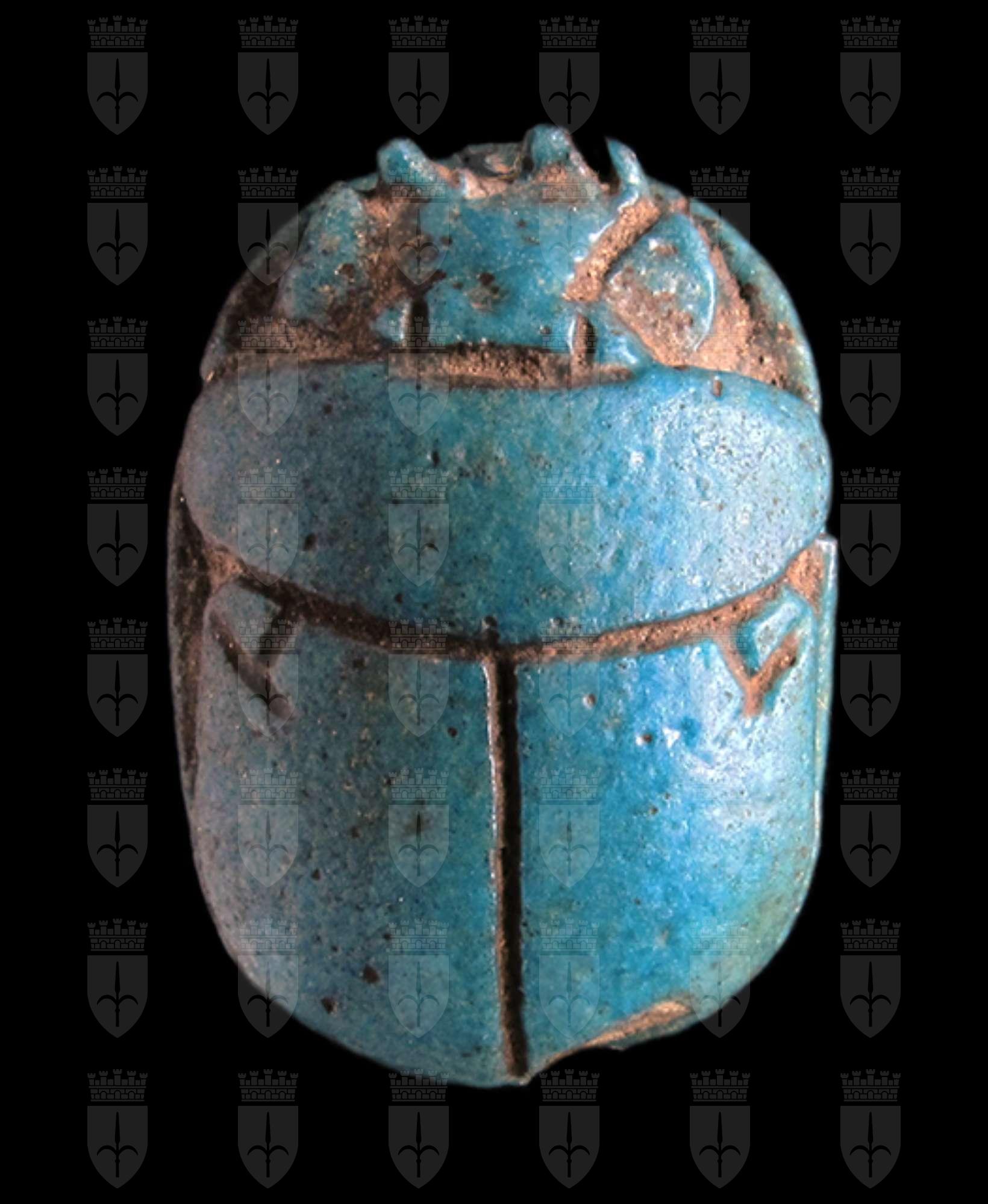 Scarabeo in faience turchese, con sul entre raffigurazione di un ugiat, sotto il quale vi è a destra un segno nefer e a sinistra il segno dell’uomo seduto con la mano alla bocca; si tratta forse dell’augurio “Salute e bene!”. Dorso con clipeo ed incisione a T per dividere il protorace e le elitre che presentano tacche a V. Foro passante longitudinale.