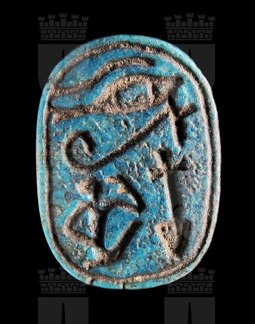 Scarabeo in faience turchese, con sul entre raffigurazione di un ugiat, sotto il quale vi è a destra un segno nefer e a sinistra il segno dell’uomo seduto con la mano alla bocca; si tratta forse dell’augurio “Salute e bene!”. Dorso con clipeo ed incisione a T per dividere il protorace e le elitre che presentano tacche a V. Foro passante longitudinale.