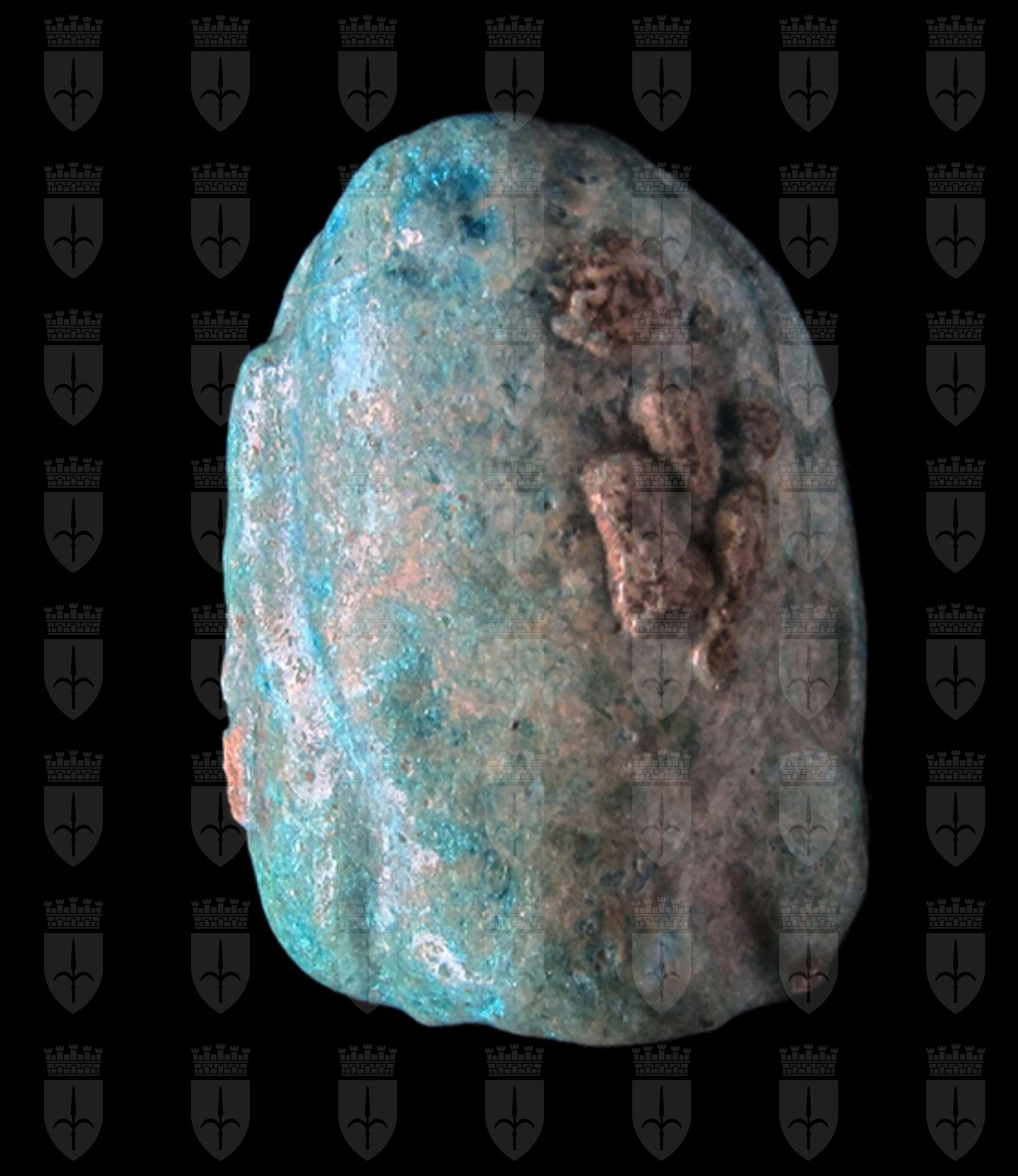 Scaraboide in faience turchese con sul ventre figura di divinità con probabile testa di sciacallo e piuma. Dorso a forma di pesce, probabilmente una Tilapia nilotica, simbolo di rigenerazione. Foro passante longitudinale.