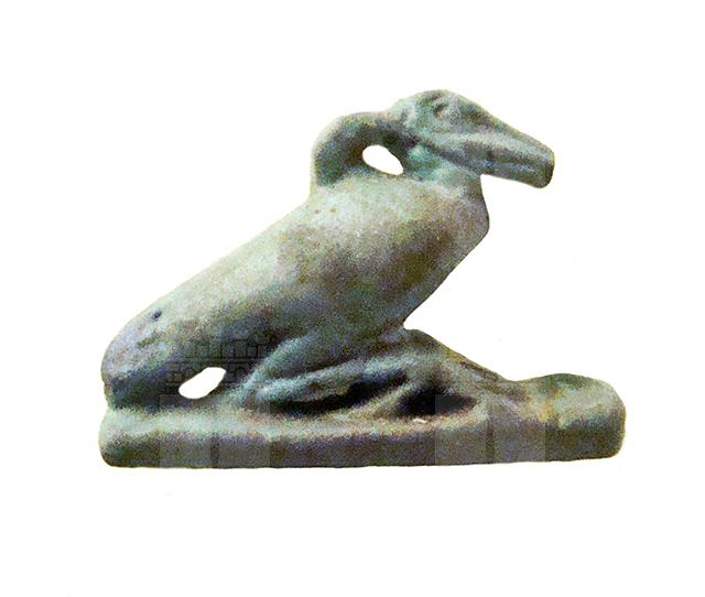 Amuleto in faience lavorato a tutto tondo, raffigurante un ibis (animale sacro al dio Thot), caratterizzato dal lungo becco a falce lunare e dal grosso corpo; le zampe poggiano su una piccola base; dietro il collo vi è un anello di sospensione.