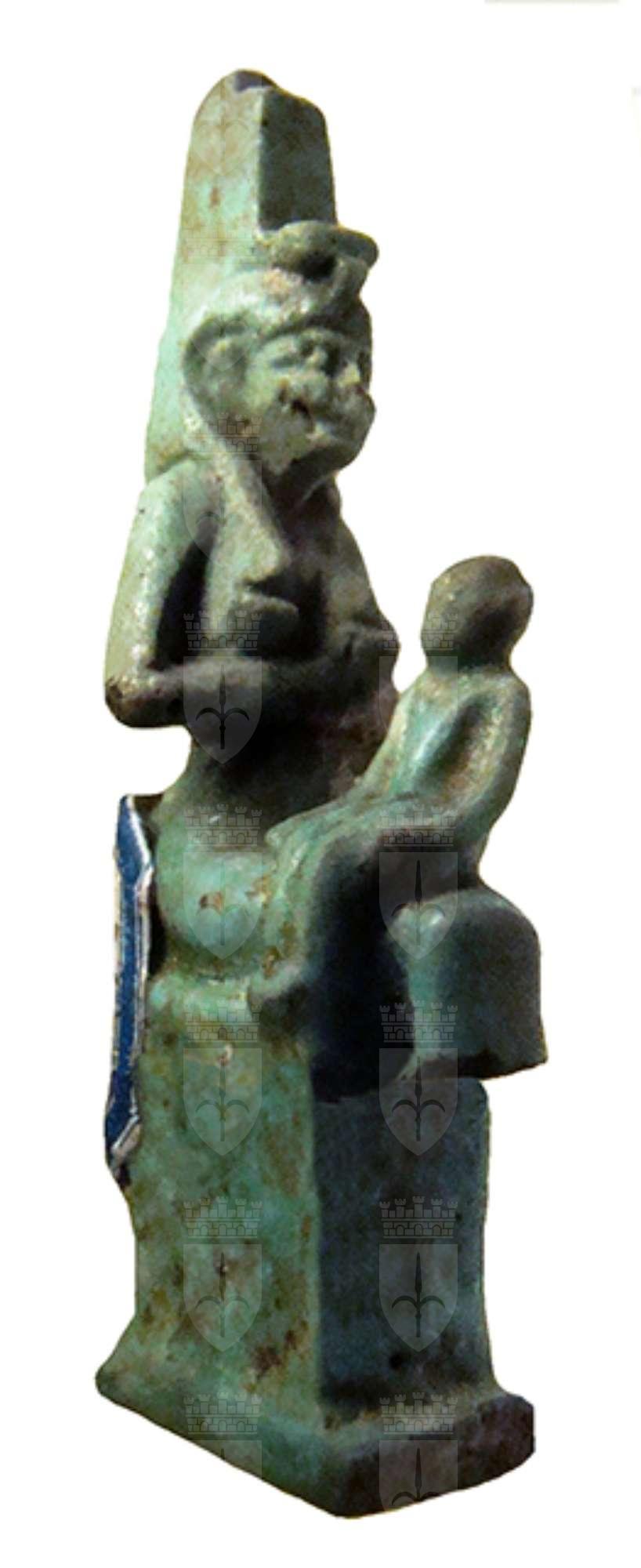 Bell'amuleto in faience raffigurante Iside seduta su un trono a basso schienale, raffigurata nell’atto di allattare il figlioletto Horus, disteso sulle sue ginocchia. Sul capo Iside porta il geroglifico del suo nome; purtroppo la parte inferiore delle gambe si è spezzata ed è andata perduta, inoltre l'amuleto è stato ricomposto da due frammenti.