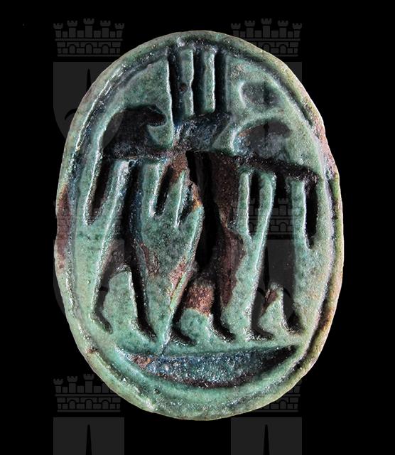 Scarabeo in faience turchese con sul ventre incisione che rappresenta una triade divina su un segno neb. Il dio centrale ha la corona di Ammone e quello di destra il disco solare sul capo.Il dorso presenta clipeo, protorace ed elitre separati da incisione a T. Foro passante longitudinale.