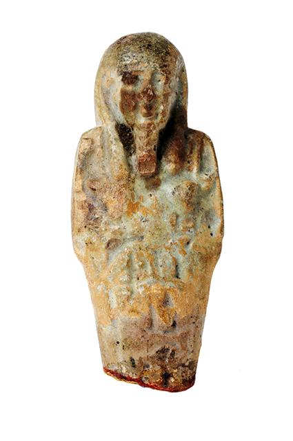Frammento superiore di statuina funeraria che indossa una parrucca tripartita e una barba divina intrecciata. I tratti del volto sono finemente modellati, le mani, incrociate sul petto, reggono una zappa e un piccone. Sotto le braccia si intravede l'inizio di un'iscrizione geroglifica, purtroppo incomprensibile. Sulla schiena è presente il pilastro dorsale.