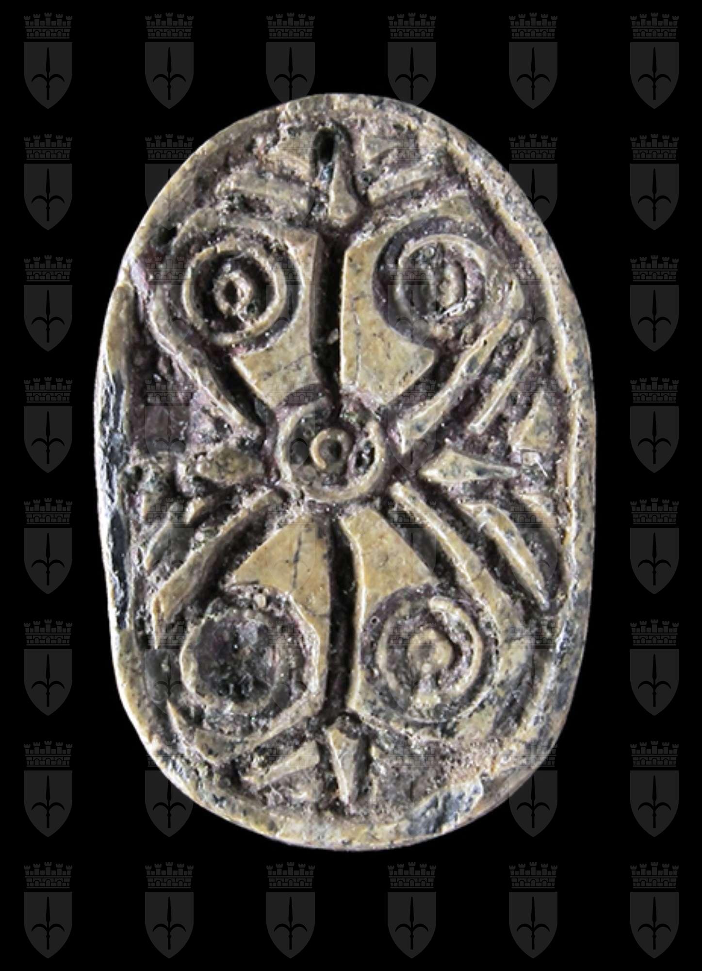 Scarabeo in steatite grigia, con sul ventre incisione di motivo geometrico con schema a croce, alle cui estremità vi sono dei fiori di loto. Sul dorso è segnata solo la testa con il clipeo. Foro passante longitudinale.