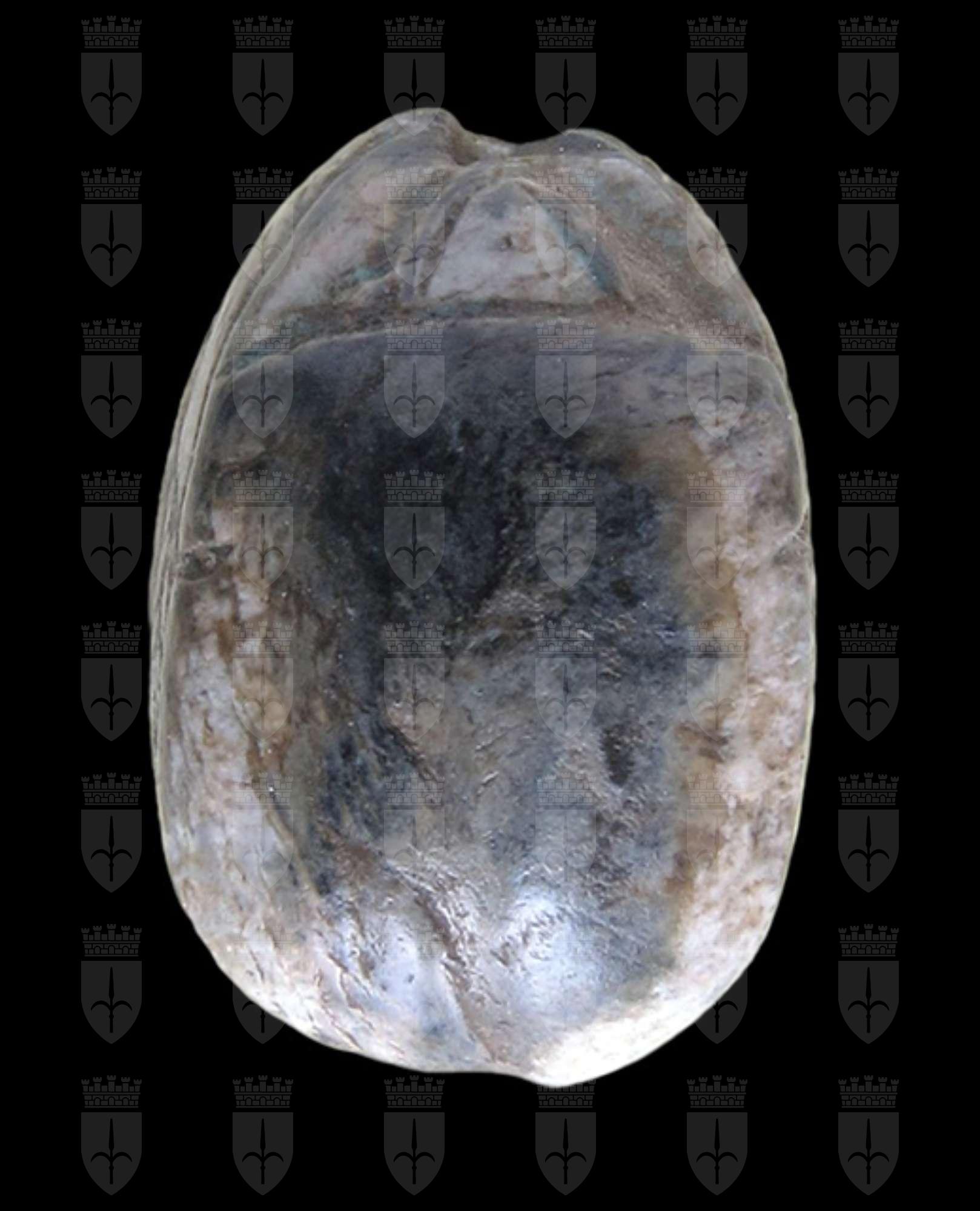 Scarabeo in steatite grigia con sul ventre incisione del cartiglio davanti ad un ureo; sopra ci sono due fiori di loto e sotto un segno neb. Il nome nel cartiglio è quello di intronizzazione di Apopi I, faraone della XV dinastia (1630-1530 a.C ). Dorso molto semplice: è visibile un’unica incisione a V sulla testa, in funzione di clipeo. Foro passante longitudinale.