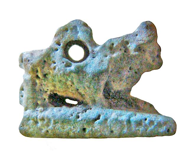 Amuleto in faience lavorato a tutto tondo, con presa forata nella parte superiore. Raffigura un toro disteso su una piccola base. A causa della minutezza dell'oggetto, i dettagli sono scarsamente distinguibili.