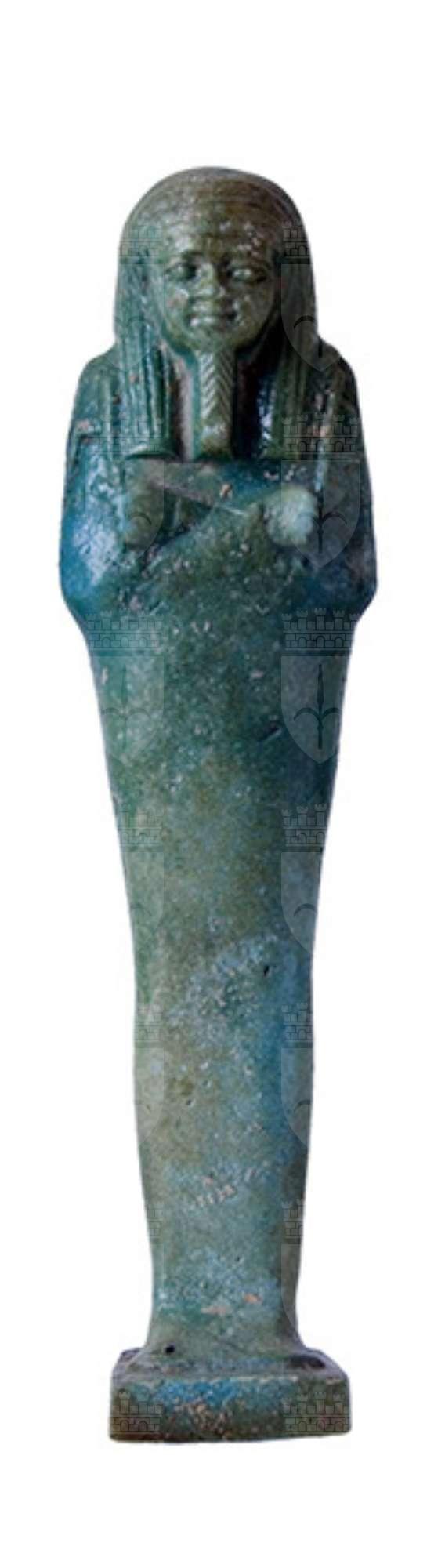 Statuina funeraria mummiforme che indossa una parrucca tripartita con fermagli e la barba divina intrecciata. Le mani incrociate, la destra sopra la sinistra, tengono rispettivamente una zappa e un piccone. Dalla spalla sinistra pende una sacca. I piedi poggiano su una piccola base. L’iscrizione corre lungo una colonna sul pilastro dorsale.