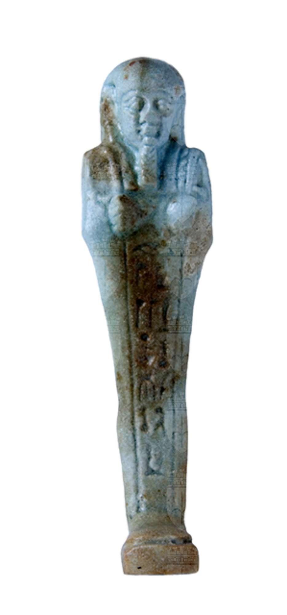 Statuina funeraria mummiforme che indossa una parrucca tripartita e la barba divina intrecciata. Le mani sono incrociate ed affiancate: nella destra tiene una zappa e nella sinistra un piccone. Dalla spalla sinistra pende una sacca. Il pilastro dorsale è presente, assieme ad una piccola base sotto i piedi. L’iscrizione si trova su una colonna frontale.