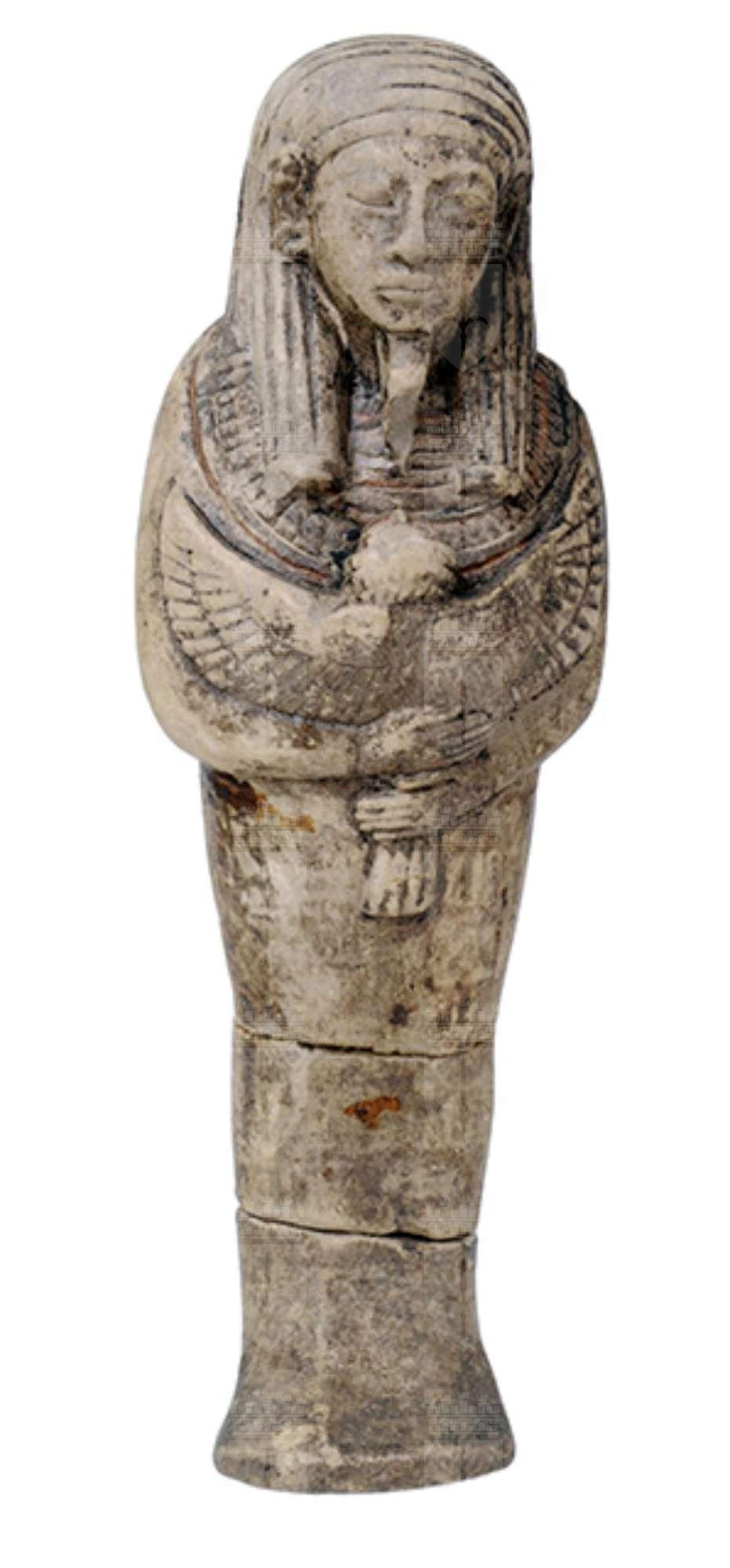 Statuina funeraria mummiforme, di aspetto insolito rispetto agli altri esemplari con la stessa iconografia, indossa un collare sul quale si intravedono ancora tracce di colore rosso e nero, la barba divina ed una parrucca tripartita nera, chiusa da fermagli. Tra le mani tiene un ba, che appoggia le sue ali spiegate sul petto della statuina. Dalla spalla destra pende una sacca. Non si vedono tracce di iscrizione, ma questa era probabilmente semplicemente dipinta, verosimilmente su fondo giallo (come sembrano suggerire poche tracce di colore).