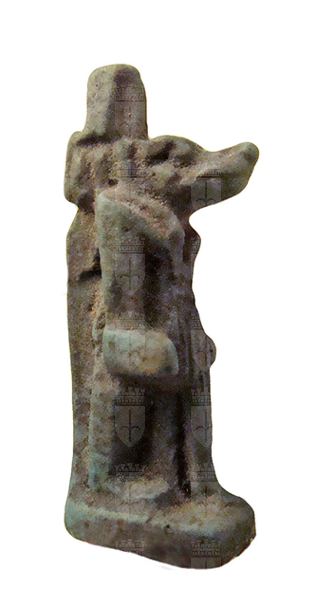 Amuleto in faience raffigurante il dio Anubi. Il dio dalla testa di sciacallo è raffigurato in piedi, nell’atto di camminare (con la gamba destra in avanti) e con le braccia stese lungo i fianchi; le mani sono chiuse a pugno. Le orecchie sono molto evidenti, così come il muso canino allungato. Indossa un corto gonnellino pieghettato. Data la minutezza della figura, i piedi poggiano su una piccola base parallelepipeda, mentre sul retro vi è il pilastro dorsale, che presenta un foro passante.