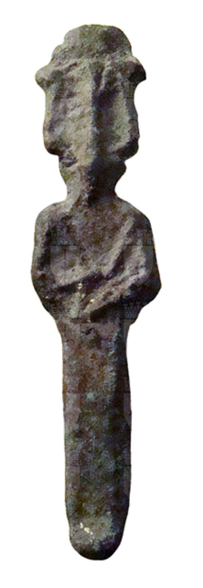 Amuleto in bronzo raffigurante il dio Osiride, dalla superficie molto consunta e dal modellato piatto. Secondo la consueta iconografia, il dio è raffigurato stante, con il corpo mummiforme da cui escono solo le mani, che reggono scettro e flagello, e la testa, sulla quale vi è la corona atef. Al mento vi è la solita barba divina posticcia. Sotto i piedi vi è un perno, attualmente spezzato.