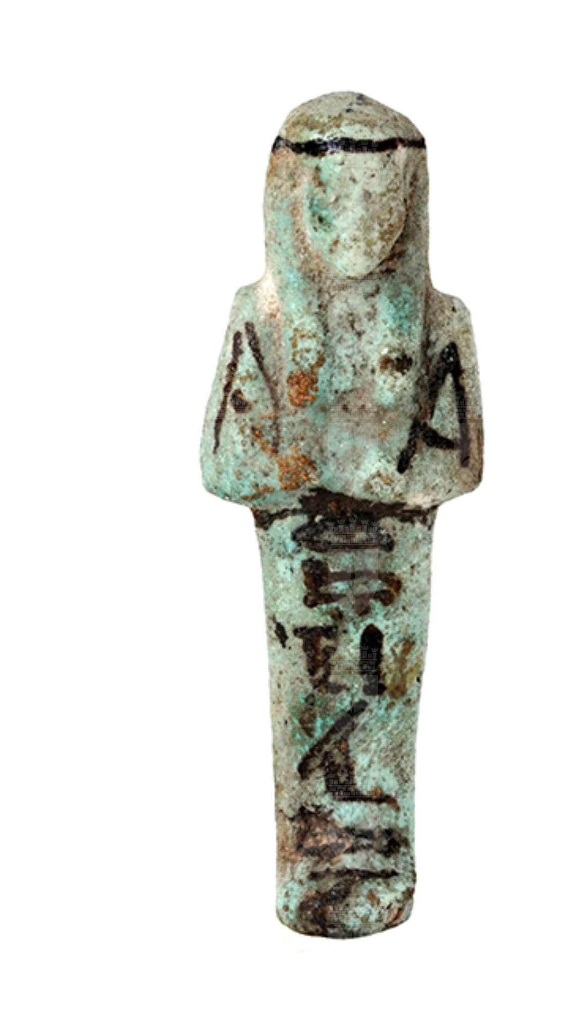 Statuina funeraria mummiforme che indossa la parrucca tripartita con il seshed. Le braccia sono incrociate sul petto, la destra sulla sinistra, e le mani reggono entrambe una zappa. Sulla schiena è sospesa una sacca per sementi. Sotto le braccia parte la colonna di iscrizione. Tutti i dettagli sono resi con dipintura in nero.