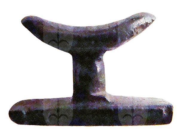 Amuleto in pietra, lavorato a tutto tondo e privo del foro passante, che raffigura un poggiatesta, con la base parallelepipeda, il sostegno centrale cilindrico e la parte sommitale arcuata per permettere l'appoggio del collo. Gli egizi usavano i poggiatesta per dormire, invece dei cuscini, a causa del caldo. Gli amuleti a forma di poggiatesta erano normalmente di colore scuro, e venivano posti sotto il collo delle mummie per garantire un tranquillo riposo nell'aldilà, senza che venisse disturbato da mostri o demoni.
