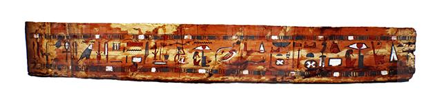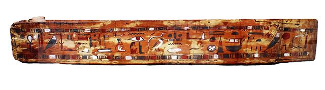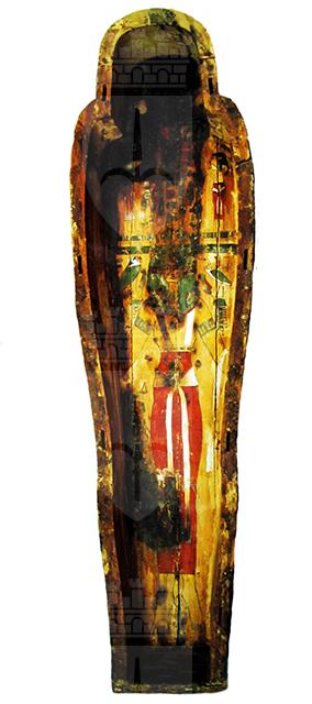 Coperchio del sarcofago Il coperchio antropoide presenta un volto dai tratti ben modellati, circondato da una parrucca a fasce longitudinali, che ricade con due bande sul petto. Sulla sommità del capo è raffigurato uno scarabeo nero con le ali aperte e allargate, fiancheggiato dal geroglifico della benda ripiegata, sormontata a destra dal segno dell’Oriente e a sinistra dalla piuma simbolo dell’Occidente. Il petto è ricoperto dal collare-usekh e da cinque registri con scene e testi, che mostrano (dall'alto): - La dea Nut ad ali spiegate, chiamata nelle brevi iscrizioni geroglifiche accanto alla testa "signora dell’Occidente" e "signora della Duat"; - Il dio Osiride, seduto su trono a basso schienale, con alle spalle la dea Iside, a cui si rivolge il dio Horo, che introduce il defunto, stante alle sue spalle. Tra i due dei, un fiore di loto sorregge i quattro geni funerari (i figli di Horo). Chiude la scena, all’estremità sinistra, su alto supporto, la dea Uto alata a testa leonina e coda di serpente, con disco solare sul capo e tra le ali il simbolo udjat. I geroglifici riportano i nomi dei personaggi raffigurati; - Al centro, in un naos (o tempietto, in forma dell’antico santuario del Basso Egitto) su un alto supporto, è posta la barca celeste Henu con un grande flabello a prua e la poppa a testa d’orice. Sulla barca naviga il Sole, in forma di falco, con il quale il defunto si identifica. A sinistra, la dea Neith inginocchiata protende le braccia flesse verso la barca, mentre dietro ha lo scettro-sekhem; in posizione simmetrica dall'altro lato, la dea scorpione Selkis, con alle spalle il geroglifico dell’Occidente. I due brevi testi accanto alle dee indicano l'azione da esse compiuta: "proteggere Pa-sen-en-hor"; - Due colonne di testo al centro (che coprono anche il rialzo dei piedi) dividono il quarto registro: a sinistra vi è una scena con il dio Horo che unge il defunto mummiforme (accompagnato da due brevi iscrizioni "Horus figlio di Iside e di Osiride" sotto la scena e "Proteggere Pa-sen-en-hor alle spalle del dio); a destra la scena è simmetrica, ma con il dio Anubi (identificato grazie all'iscrizione sotto la scena, che recita "Anubi, signore della terra sacra, preposto alla tenda dell'imbalsamazione"); - Sul rialzo dei piedi, ai lati delle colonne del testo, due emblemi dell’Occidente. Cassa del sarcofago Sui lati esterni della cassa vi sono due uniche righe di iscrizione in bei caratteri geroglifici, mentre all'interno il fondo della cassa è occupato per circa due terzi dalla figura della dea Nut, ritta, vista frontalmente. La dea ha braccia aperte, flesse verso l’alto, protese sui lati della cassa, e in ciascuna mano tiene il segno della vita. Porta sul capo ampia parrucca dipinta in verde, le cui bande anteriori le incorniciano il volto, disegnato frontalmente. Vicino al corpo della dea, a sinistra, si scorgono tracce di segni geroglifici, purtroppo illeggibili. All’altezza del capo, la dea è fiancheggiata, a destra dal falcone Harakhti (= Horo dell’Orizzonte) e a sinistra da un airone, sui quali sono alcuni geroglifici e il segno della vita; ambedue gli uccelli stanno sul geroglifico dell’Occidente, e sono dipinti in verde, col piumaggio nero e bianco. Sopra la dea Nut, e separato da questa da due fasce verde scuro (quella inferiore con una serie di stelle affiancate, ideogramma del cielo stellato, quella superiore a segmentini verde chiaro) si erge il pilastro djed sormontato dal disco solare, e fiancheggiato da due dee, molto probabilmente Iside e Nefti. La zona davanti all’altra dea e quella soprastante il disco solare in corrispondenza all’appoggio della testa del defunto, invece, sono fortemente impregnate di bitume.