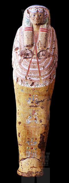 Il sarcofago antropoide, in legno stuccato e dipinto, contiene ora una mummia di vecchio uomo non pertinente. La superficie è dominata dal colore giallo. Il coperchio, di forma antropoide, presenta un volto a lineamenti regolari, con grandi occhi, naso dritto (purtroppo ora spezzato) e piccola bocca serrata; non ci sono tracce del foro per l’attacco della barba divina. La defunta indossa una lunga parrucca, con piumaggio sui lati, trattenuta sulla fronte da una fascia decorata a pendenti di fiori di loto. Le due bande della parrucca scendono sul petto, a trecce rese da quadrettatura policroma, legate a metà altezza da doppio nastro rosso. La sommità del capo, piatta, conserva il colore corvino dei capelli. Le bande della parrucca terminano orizzontali, subito sopra i seni, di forma semicircolare con una rosetta rossa a coprire i capezzoli. Tutta la parte superiore, dal petto al ventre, è occupata dalla collana usekh a molti giri di perline, e da una ghirlanda vegetale, terminante in basso con fiori di loto; il petto è attraversato da due nastri diagonali rossi, che si incrociano al centro. Le mani, mancanti, probabilmente stese, erano realizzate a parte e fuoriuscivano incrociate al di sotto dei seni. La parte centrale presenta quattro registri orizzontali, che sono (dall’alto): un disco solare rosso alato; alla destra un avvoltoio Nekhbet e una figurina osiriana con disco solare in capo inginocchiata rivolta al centro, che impugna scettro e flagello; alla sinistra l’immagine si ripete in maniera simmetrica; uno scarabeo, sormontato da disco solare con doppio ureo, tra due figurine di Osiride contrapposte: quest’ultime su seggio rettangolare con basso schienale, con mantellina quadrettata, impugnano scettro e flagello, portano il pizzo al mento e sono coronate da disco solare. A destra e a sinistra le due dee Iside e Nefti aprono le ali protettrici; alle loro spalle, a destra, un segno dell’Occidente a cui si volge un genio stante rivolto verso il centro; a sinistra, un genio che impugna scettro e flagello inginocchiato su un segno neb rivolto verso il centro; La dea Nut alata; a destra un genio inginocchiato con testa di sciacallo impugna scettro e flagello, rivolto verso il centro, e a sinistra un genio stante con testa umana rivolto verso il centro; un segno ged, sormontato da disco solare con doppio ureo, è tra due figurine di Osiride contrapposte (simili alle precedenti). A destra e a sinistra rivolti verso il centro due cobra aprono le ali protettrici; alle spalle di quello di sinistra un genio stante rivolto verso il centro. La metà inferiore del coperchio è separata da quella superiore da un’alta fascia decorativa terminante in alto con una teoria di urei. A partire da questa fascia, la zona sottostante è divisa in tre colonne, a loro volta suddivise ciascuna in due registri. Queste tre colonne sono separate da due colonne di geroglifici che continuano anche sui piedi. A sinistra un genio stante rivolto verso il centro; sotto tre geni stanti rivolti verso l’esterno, di cui il centrale a testa di cobra. A destra un genio stante rivolto al centro è contrapposto a un Osiride con disco solare sul capo, che impugna scettro e flagello, inginocchiato, tra loro sta una nebride. Sotto tre geni stanti rivolti verso l’esterno, di cui il centrale a testa di cobra. Al centro un tit sormontato da un disco solare con doppio ureo tra due figurine osiriane inginocchiate, rivolte verso l’interno; sotto, un simbolo dell’Occidente, anch’esso sormontato da un disco solare con due urei, tra due coppie di geni funerari stanti, rivolti verso l’interno. La parte esterna, inferiore, dei piedi ha perduto la stuccatura e mostra la venatura del legno. Ai lati delle colonne di iscrizione (vedi trascrizione) si vedono però le figure di una dea in forma di avvoltoio, con il flagello e un segno ankh tra le zampe. Tra di esse, invece, ci sono altre tre brevi colonne iscritte, leggibili soltanto in parte. I fianchi esterni della cassa mostrano lungo l’orlo superiore un fregio costituito da urei poggianti su un piano a riquadri rossi e azzurri, tra linee verticali. Il campo principale è decorato a pannelli, in cui vignette si alternano a colonne di testo, le quali ripetono con insistenza le medesime formule. Su tutta la cassa sono presenti solo sette diverse formule, che sono distribuite lungo i fianchi con vari schemi (vedi trascrizione). Scene sul lato destro del sarcofago a partire dal capo (si noti che tutti i segni geroglifici presenti all’interno delle scene figurate sono puramente decorativi): tre ged e un tit, sovrapposti ad alcune figure di cui risulta leggibile l’avvoltoio della dea Nekhbet, alla quale si rivolge una figura mummiforme stante, preceduta dal segno dell’Occidente; una figura mummiforme stante (forse il defunto) davanti a un incensiere e una nebride sormontata da Nekhbet e scrigno, rende omaggio al dio Osiride mummiforme e privo di corona, seduto su seggio con bassa spalliera, con in mano lo scettro e il flagello; due figure mummiformi stanti rendono omaggio a Osiride; tra loro una nebride e l’avvoltoio Nekhbet; un tit, con disco solare e due urei, sta al centro di due coppie di geni mummiformi stanti, rivolti verso l’esterno; tutte queste figure poggiano su un segno neb; il feticcio di Abido, sormontato da disco solare con la doppia piuma, al centro tra due figurine mummiformi stanti, sormontate anch’esse da disco solare, volte all’esterno, verso i due segni dell’Occidente che occupano le estremità della scena; il simbolo dell’Occidente, al centro, tra due figure di Osiride seduto, sormontate rispettivamente da un disco solare rosso, a sinistra, e da un disco solare blu; al dio di destra si rivolge una figura mummiforme stante, mentre ai piedi di quello di sinistra vi è un incensiere; fasce diagonali sinuose e punteggiate, rosse e blu, indicano la montagna sacra dell’Occidente. La zona piana in corrispondenza del fondo dei piedi ha 