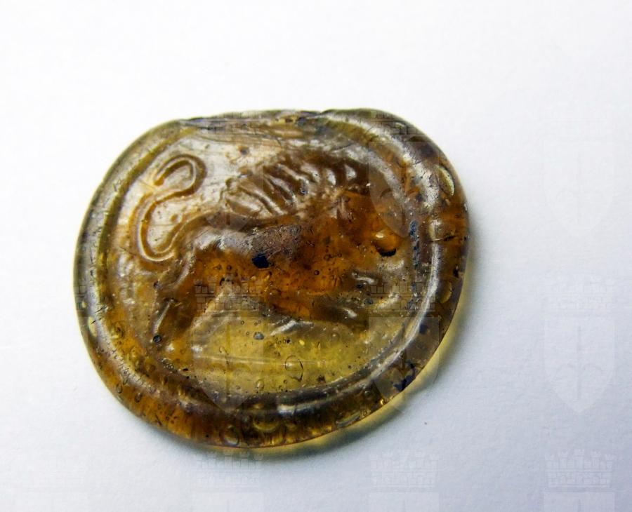 Forma circolare; bordo rilevato; appiccagnolo spezzato. Decorazione data da leone in corsa a ds.