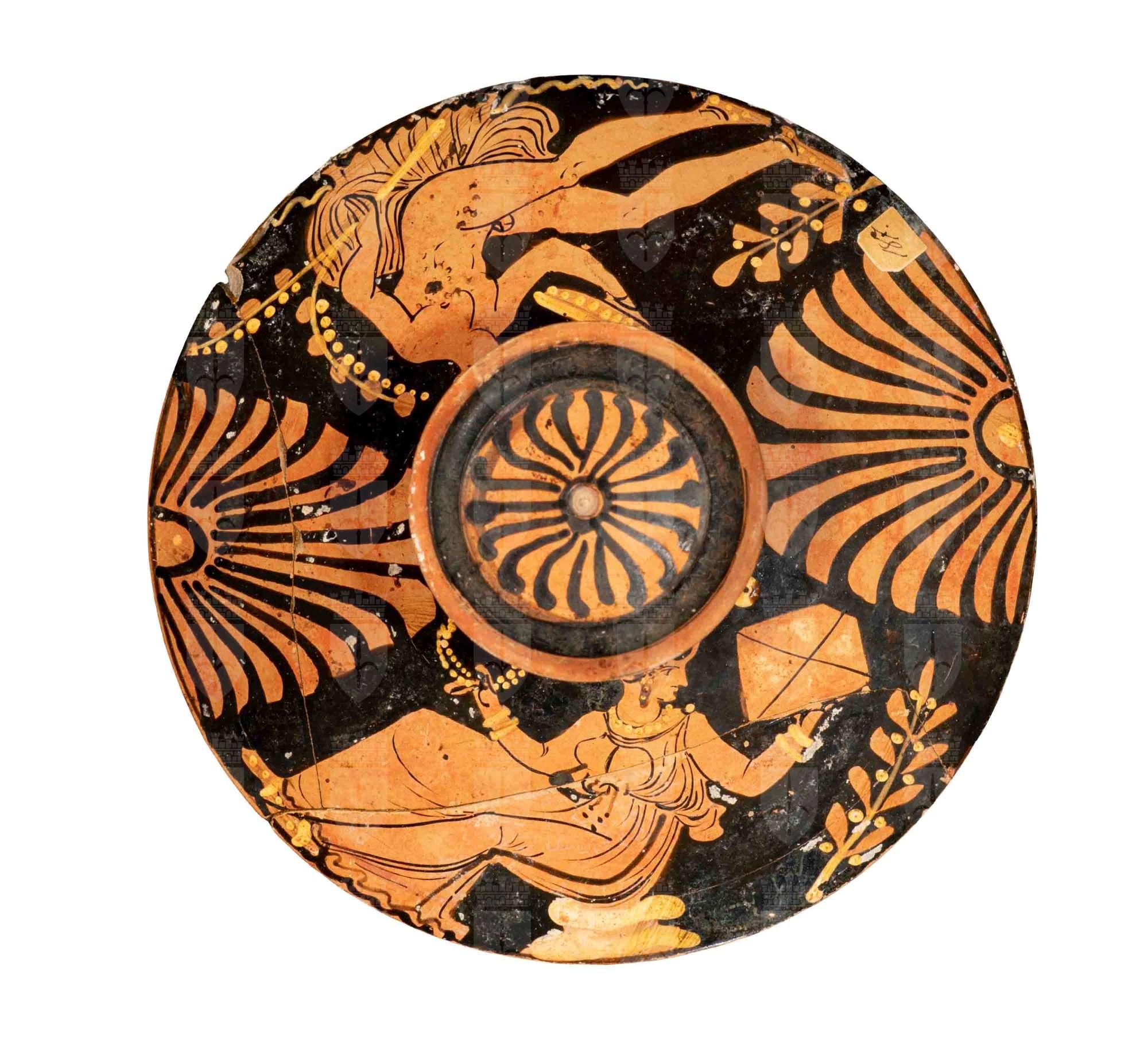 Coppa di lekanis aapula con fascia decorativa a linee verticali tra le anse. Coperchio di lekanis apulo a figure rosse. Lato A: giovane nudo seduto con patera e diadema sul capo; Lato B: donna in chitone seduta con scrigno e corona di corimbi nelle mani. Tra A e B due palmette.