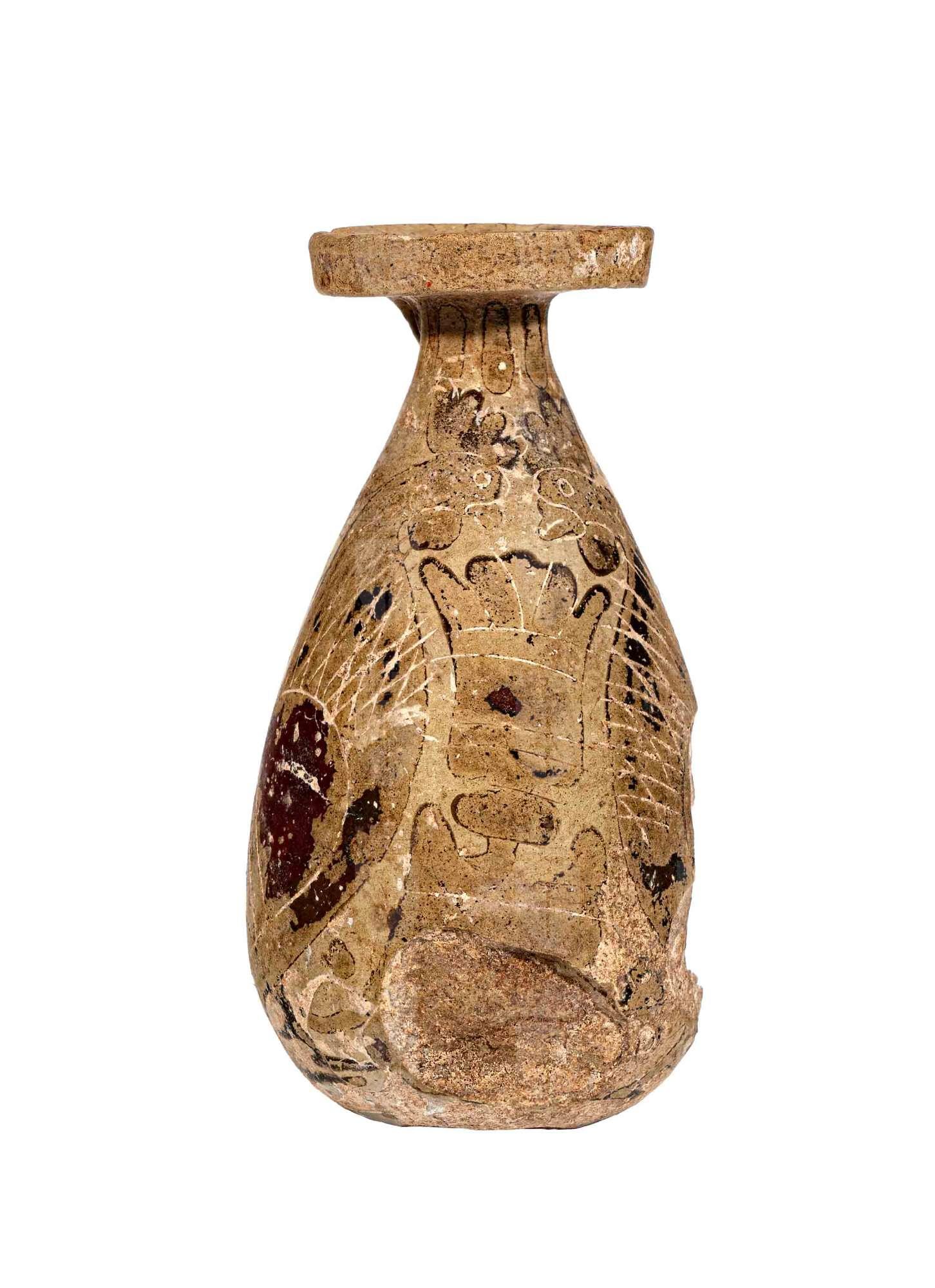 Alabastron corinzio piriforme con due galli affrontati (colore rosso e nero); linee e rosette sul campo e sul collo.