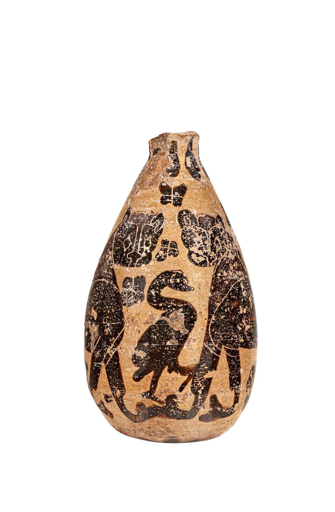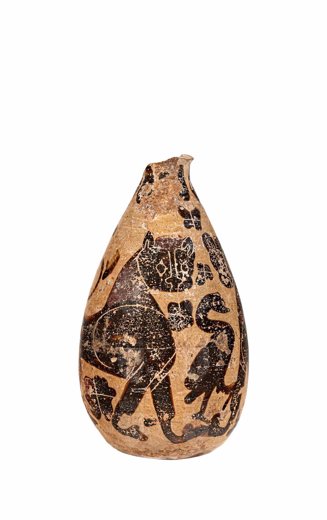 Alabastron piriforme con due pantere affrontate e in mezzo cigno ad ali abbassate; nel campo rosette con ritocchi di colore rosso.