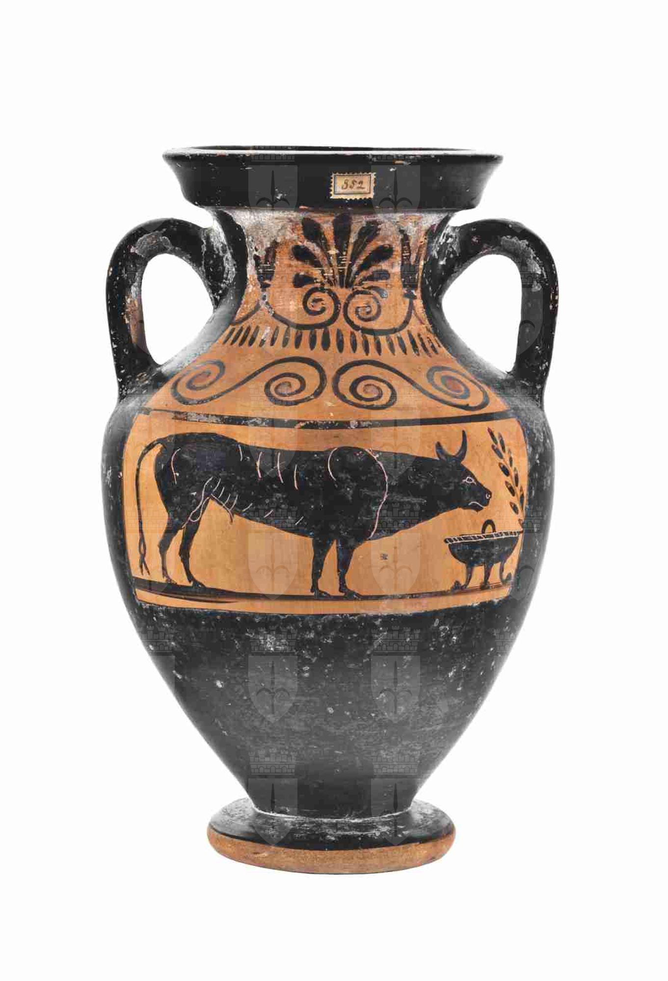 La forma dell'anfora è affine a quella delle anfore campaniformi attiche di tipo B; l'orlo è svasato e modanato, e si attesta su un corto collo cilindrico, dal profilo convesso. Le anse a bastoncello si impostano verticalmente tra il collo e la spalla, poco rilevata, e il corpo ovoide, molto rastremato verso il fondo, poggia su un piede ad echino rovesciato semplice. La vernice nera, piuttosto lucida, è uniforme e copre tutta la superficie del vaso, compreso l'interno del collo, fatta eccezione per i due spazi decorati e una fascia risparmiata alla base del piede; alcuni dettagli della decorazione secondaria presentano inoltre sovradipinture rosse. Il colore dell'argilla è Munsell 7.5YR 5/4 (brown). La decorazione principale del lato A presenta, in un riquadro, limitato in alto da una linea nera, un bovino, fermo e perfettamente di profilo, ma con le gambe in posizione sfalsata, tutte perfettamente visibili; le corna sono a mezzaluna, mentre la lunga coda è biforcuta. Sono rappresentati anche i dettagli della muscolatura, del costato e dei genitali. A destra della scena troviamo un louterion, con una presa centrale in alto e l'orlo decorato, e un ramo d'ulivo, che spunta la bordo destro del riquadro; una linea nera fa da appoggio al motivo figurato. Il lato B presenta un semplice fregio vegetale limitato da due linee nere, composto da tre palmette, una delle quali sborda dal riquadro risparmiato, intervallate da coppie di boccioli di loto; dai boccioli si dipartono due tralci a spirale, che si incontrano alla base delle palmette andando a costituire delle volute. La decorazione accessoria su spalla e collo è pressoché simmetrica sui due lati del vaso, con un motivo a doppia spirale contrapposta sulla spalla, arricchito da un punto rosso al centro delle spirali (meno accurato sul lato B, poiché una della spirali sborda dal riquadro riservato alla decorazione), limitato alla base del collo da una sequenza di linguette nere. Sul collo troviamo nuovamente il motivo a palmette e boccioli di loto, analogo a quello presente sul riquadro del lato B, con una palmetta centrale con volute affiancata dai boccioli. Sull'orlo, sul lato A, è presente una vecchia etichetta, recante un precedente numero di inventario ('852').