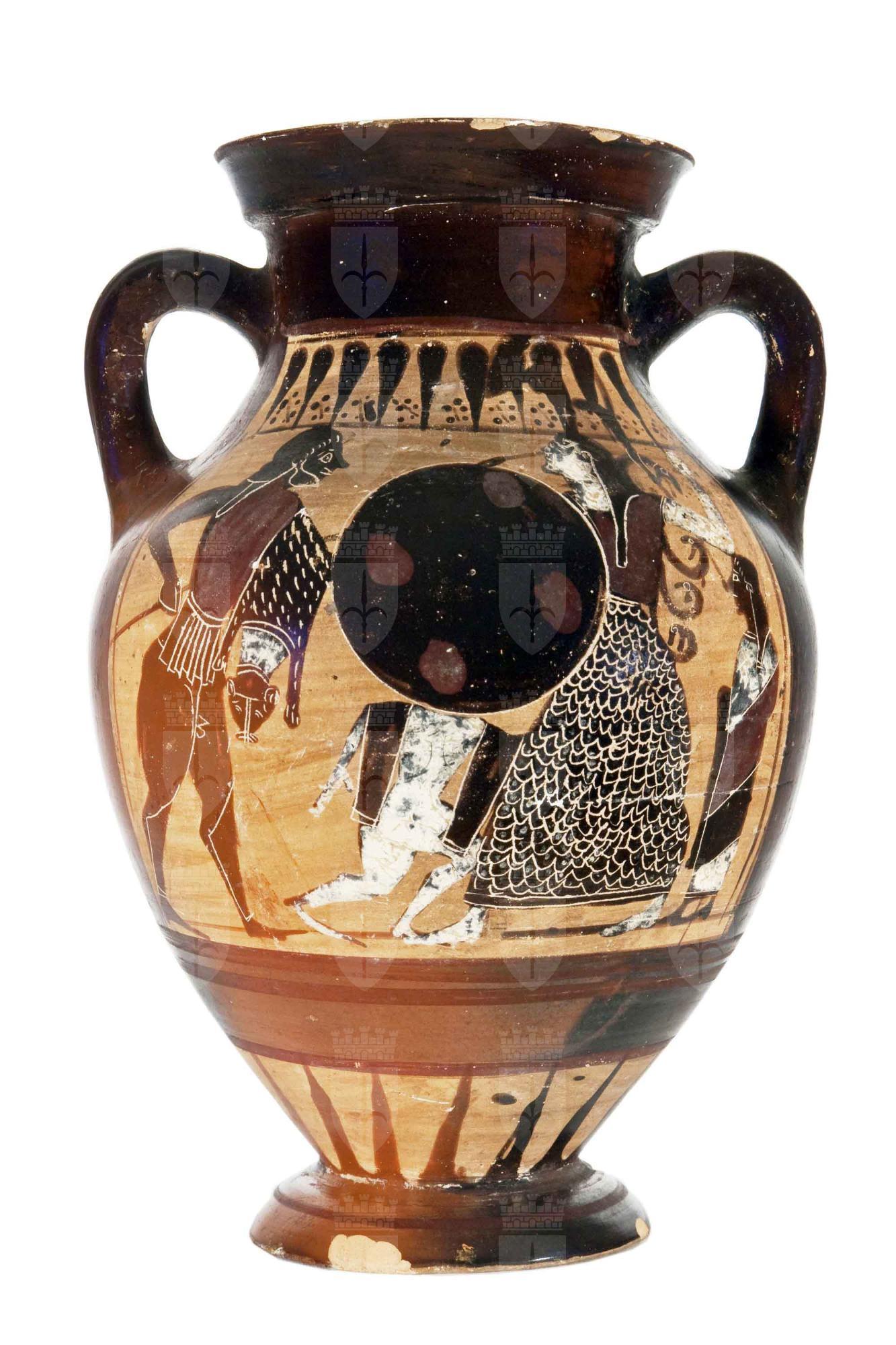 Piccola anfora a figure nere con colori aggiunti e graffito. Lato A: Il centro è occupato dall’Idra, il mostro dal corpo anguiforme a scaglie arrotolato e dalle molte teste; a sinistra, Eracle, coperto dalla leonté, afferra una delle teste del mostro per reciderla con la spada dentata, mentre ai suoi piedi ce n’è un’altra tagliata; lo aiuta, sulla destra, il giovane Iolao, pure egli armato di spada. Lato B: L’eroe della guerra di Troia, Aiace, armato di lancia è stante con indosso la corazza, gli schinieri e una pelle di pantera, si rivolge verso il centro della scena, dov’è il Palladio, l’immagine sacra di Atena, dall’elmo con alto lophos, egida a serpentelli e lungo chitone, armata di lancia e grande scudo rotondo; sotto ad esso, cerca di nascondersi Cassandra, dalla figuretta seminuda. Uno spettatore osserva la scena, a destra.