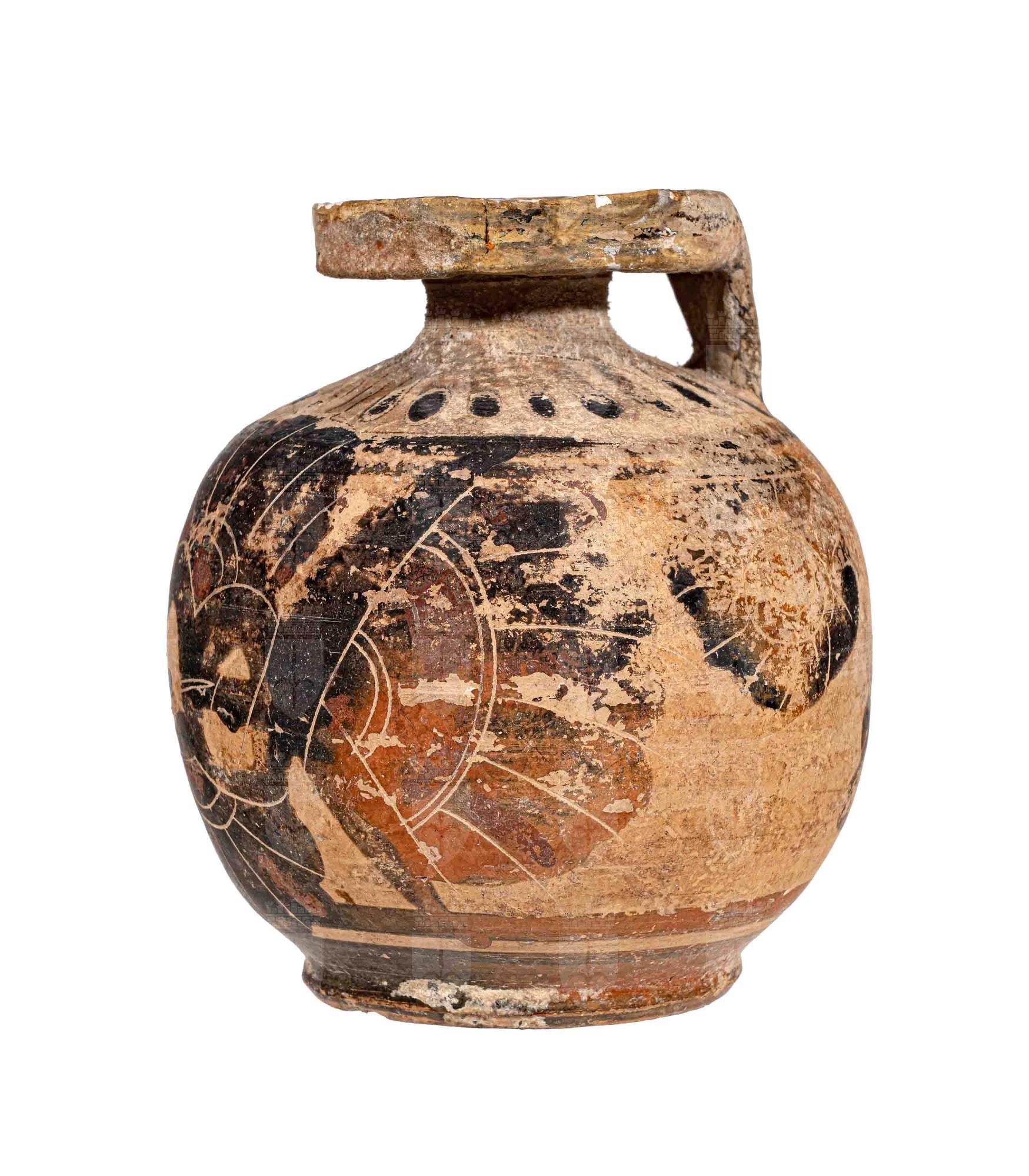 Grande aryballos corinzio con uccello visto frontalmente con le ali spiegate (civetta?) e altro uccello (gallo) in atto di camminare.