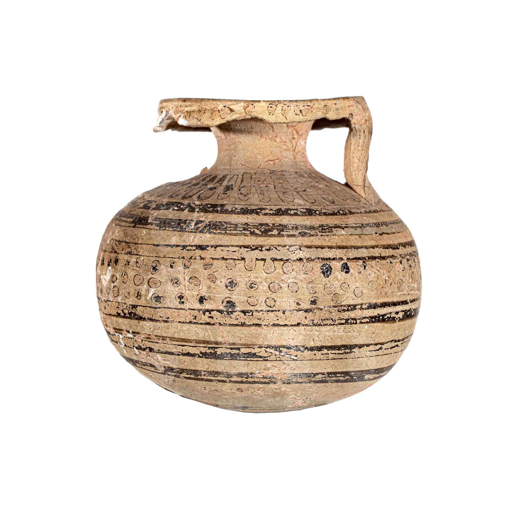 Aryballos corinzio con decorazione a fasce e ovuletti di color bruno, cerchi sul collo.