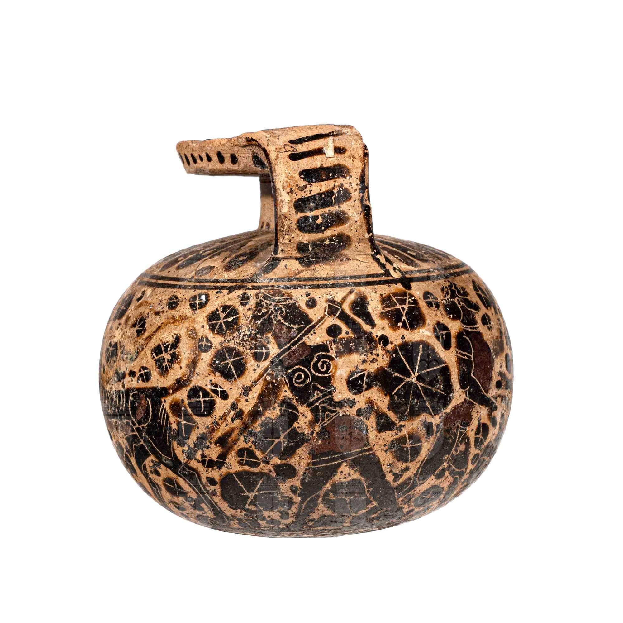 Aryballos corinzio con pantera, guerrieri e toro tra rosette.