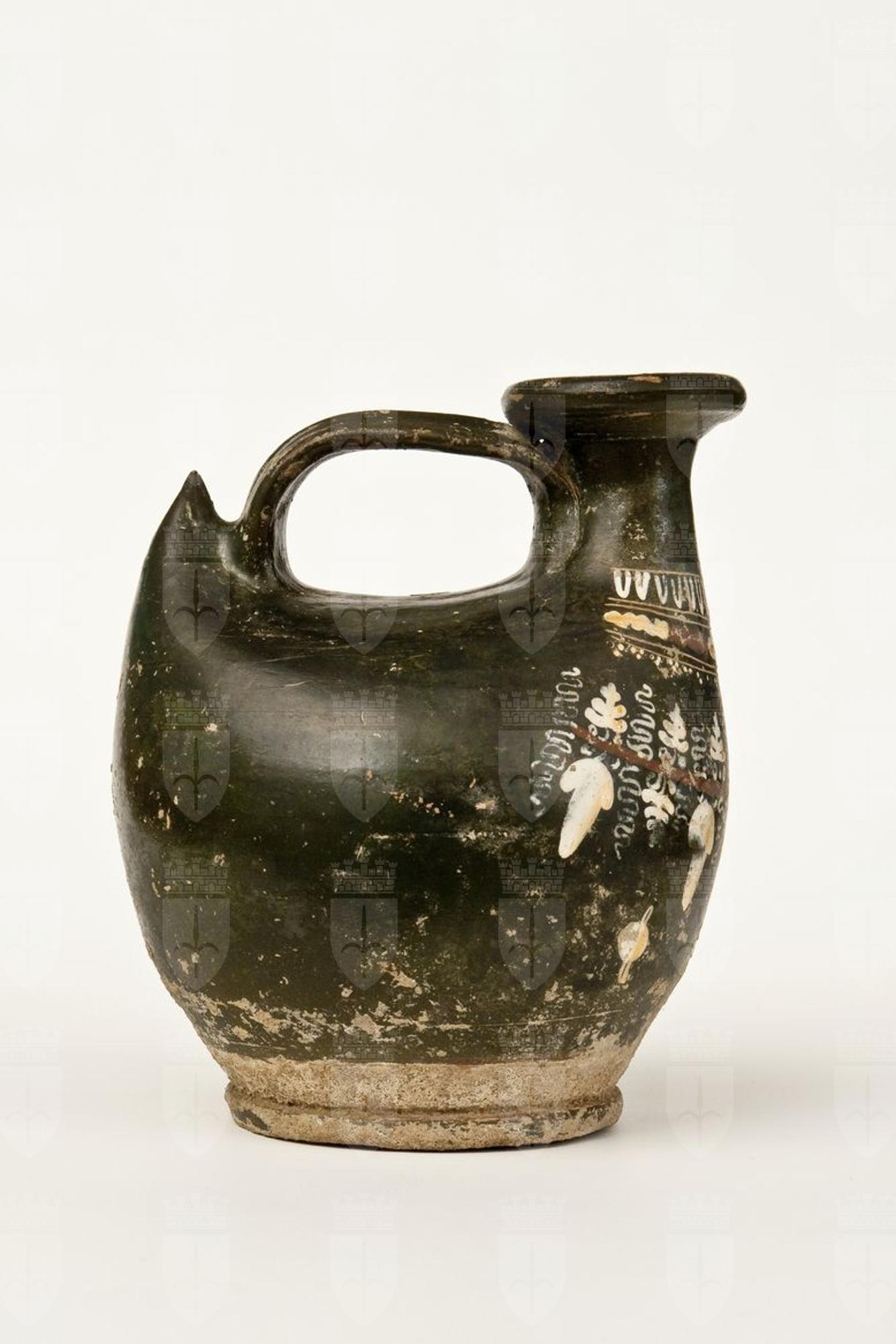 Askos con palla di lana e coppa a vernice nera con sovraddipinture in bianco, giallo, ocra e rosso amaranto ed incisioni. Orlo rigonfio leggermente introflesso, collo cilindrico a profilo concavo, corpo globulare schiacciato, ansa a nastro orizzontale impostata longitudinalmente sulla parte superiore del corpo e saldata al collo, basso piede ad anello. Sul collo: tra una linea incisa e due coppie di linee incise, sequenza di ovuli dipinti in bianco crema e tremuli giallo-rossi, seguiti da gruppi di tre punti. Sul corpo: tralcio di vite con stelo in rosso amaranto, grappoli, pampini, viticci e una rosetta con bottone centrale e petali a cerchio.