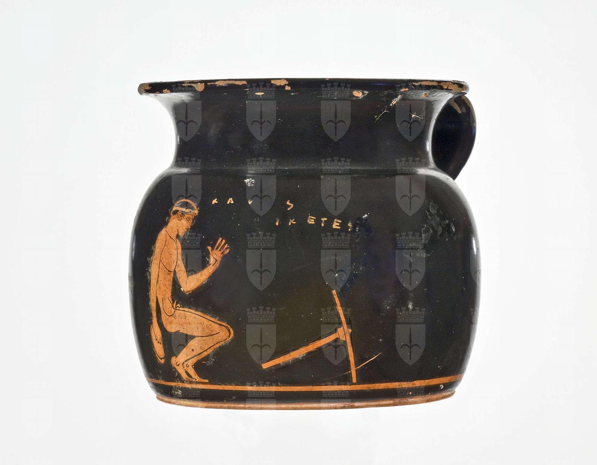Boccale a figure rosse con immagine di un atleta in atto di saltare; piccozza poco più avanti; Iscrizioni: KALòS HIKèTES (bello è Ichete).