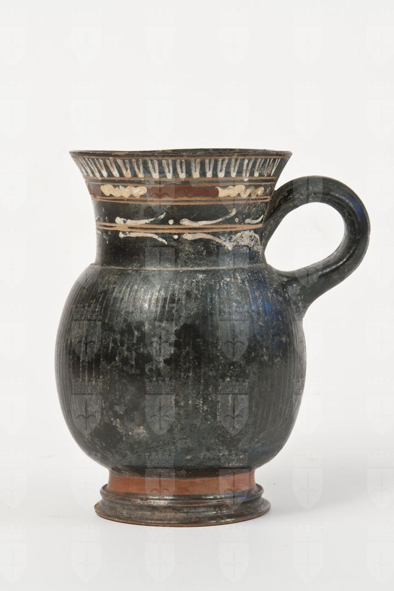 Boccaletto baccellato a vernice nera con sovraddipinture in bianco, giallo e rosso amaranto ed incisioni. Orlo estroflesso, collo troncoconico con lieve modanatura alla base, corpo globulare strigilato espanso, ansa a nastro ad anello schiacciato impostata verticalmente all’attacco tra il collo ed il corpo, sotto l’ansa una “X” con al centro un’asta verticale impressa, gola di raccordo, piede troncoconico modanato. Sotto l’orlo: tra una linea incisa e due coppie di linee incise, sequenza di ovuli dipinti in bianco e tremuli giallo-rossi. Sul collo: ramo di ulivo selvatico con stelo reso attraverso due linee incise, coppie di foglie e bacche dipinte in bianco.
