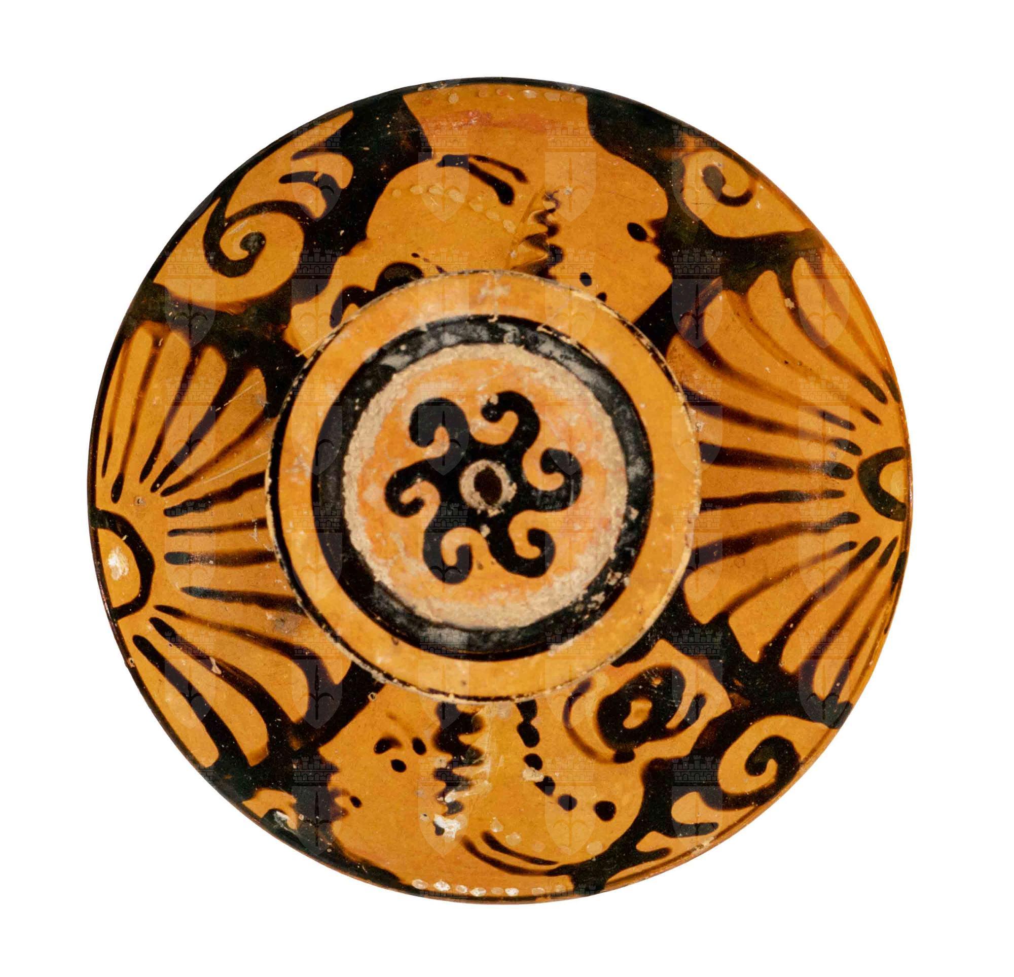 Coperchio di lekanis apula a figure rosse con presa a disco; Lato A e B: testa femminile con mitella tra palmette.