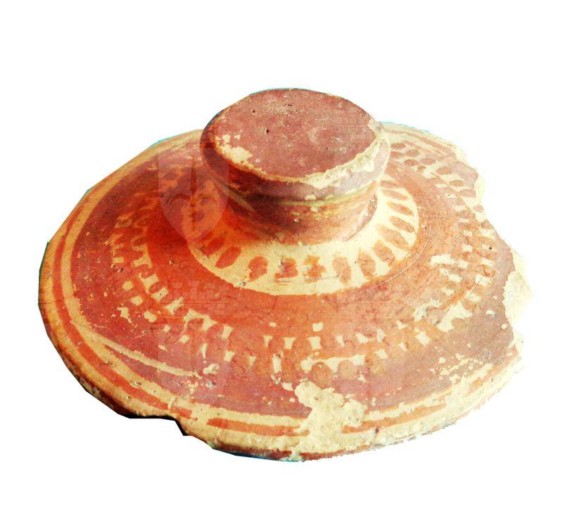 Coperchio con piccola presa a fasce rosse concentriche che delimitano una a scacchiera, presa verniciata e alla sua base trattini a raggiera.