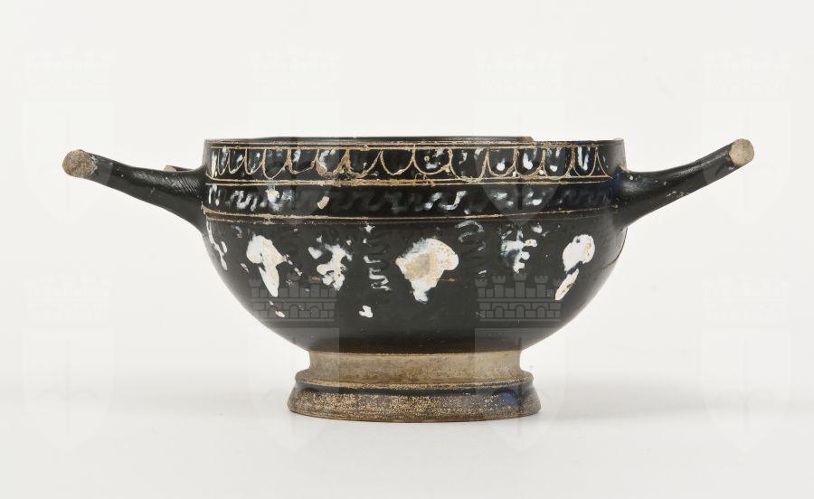 Cup skyphos a vernice nera lucente con sovraddipinture in bianco, giallo e incisioni. Orlo leggermente estroflesso, vasca emisferica, anse a bastoncello (sormontanti l'orlo), gola di raccordo, piede troncoconico. Lato A: tra tre coppie di linee incise, ovuli incisi e dipinti con punti, meandro merlato, grappoli, pampini, viticci e germogli in bianco-giallo. Lato B: Tralcio di edera con stelo lineare inciso e foglie cuoriformi.