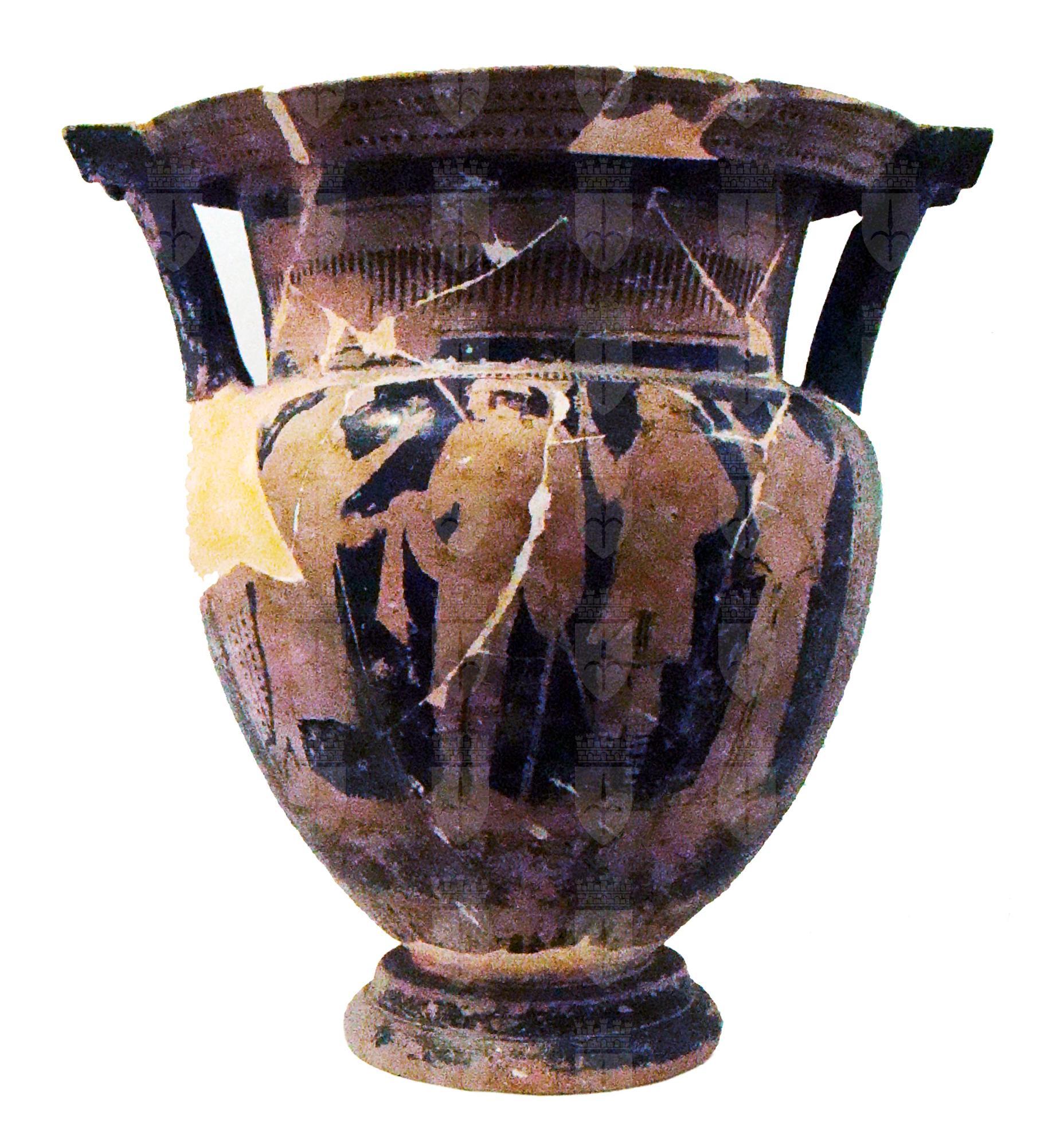 Cratere a colonnette a figure rosse. Labbro estroflesso; orlo piatto a tesa ripiegata, dal quale si dipartono diametralmente due placche rettangolari con bordo pendulo. Collo trancoconico a profilo leggermente concavo. Spalla pronunciata a profilo convesso. Corpo ovoide schiacciato verso il basso, distinto dal piede da un sottile cavetto. Anse verticali a sezione circolare, impostate sulla spalle e sotto le placche presso l'orlo. Piede ad echino cavo, con doppia mondatura distinta da cavetto. Lato A: scena di comminato. Al centro, guerriero stante, frontale con testa di profilo verso sinistra; ritratto nudo eccetto per il mantello. Questo, ripiegato e passante dietro la schiena, in appoggio all’avambraccio destro e sulla spalla sinistra, ricade in avanti a coprire parte del busto, con la sinistra tiene sollevata una lunga lancia obliqua. Con la mano destra stringe la mano del personaggio sulla sinistra della scena. Quest’ultima figura, maschile, ammantata è ritratta di profilo rivolta verso destra. Indossa un himation lungo fino a poco sotto il ginocchio, con i lembi del mantello ripiegati e fissati sul petto. Stringe con la destra il guerriero, mentre la sinistra è ritratta sollevata a mezz’aria, per appoggiarsi alla spalla o al braccio del giovane oplita. Davanti a sé l’uomo ha un lungo bastone. Sempre al centro, alla sinistra del guerriero, è rappresentata un’altra figura maschile, stante e rappresentata come soldato, barbato e con doppia lancia. Infine, sulla destra, una figura femminile ritratta stante di tre quarti, con viso e piedi di profilo verso destra, allarga in alto le braccia in segno di disperazione per la partenza del giovane. Indossa himation e i capelli sono resi con piena campitura a vernice nera. Lato B: tre figure ammantate con fiaccole. Sulla sinistra figura maschile, di cui rimane visibile solo parte del busto e della testa, ritratta di profilo verso sinistra, imberbe con i capelli a calotta. Al centro, la figura maschile imberbe è posta di profilo, e regge due fiaccole. L’ultima figura conserva solo la parte inferiore della veste e delle gambe.