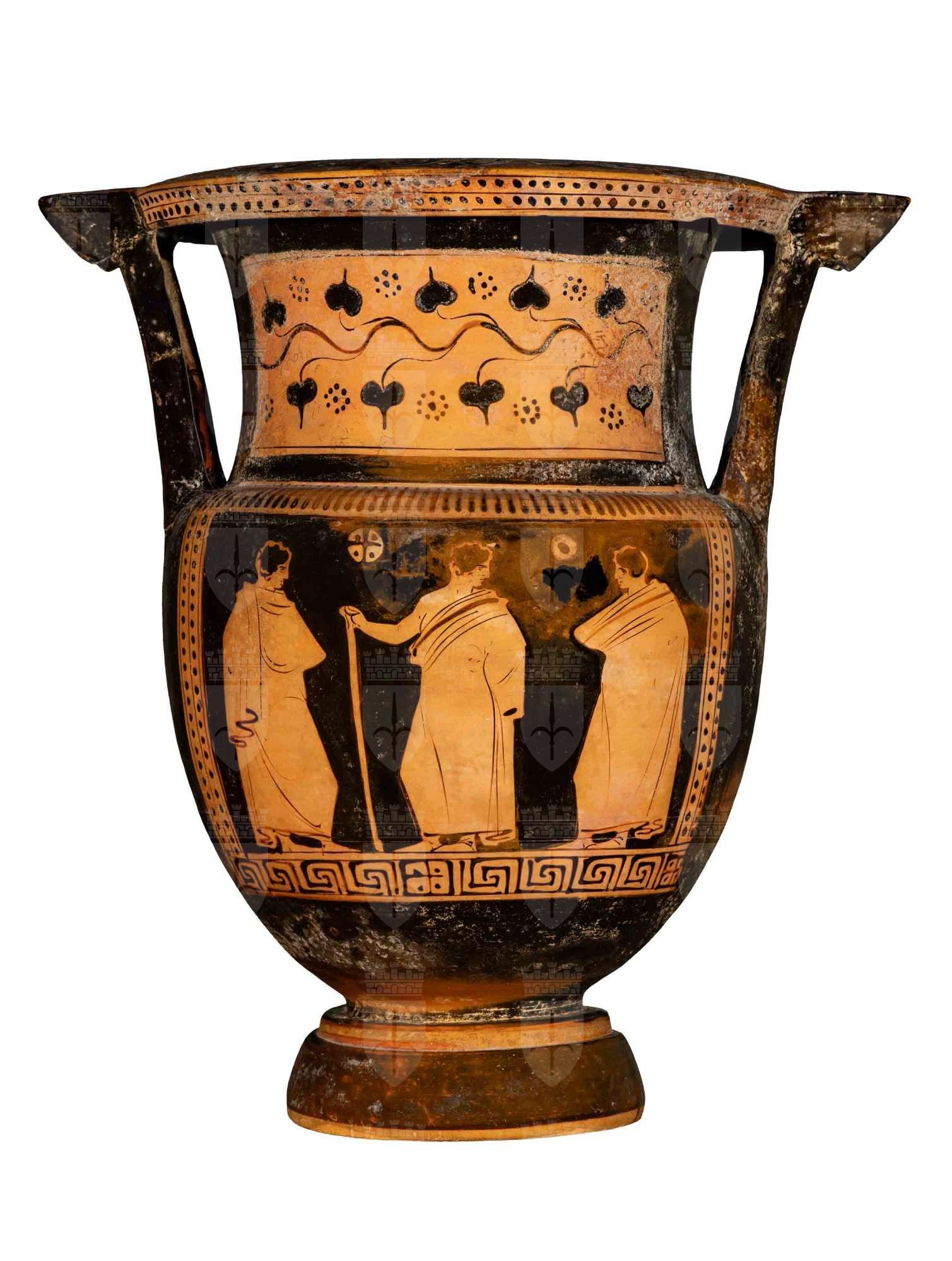 Cratere a colonnette apulo a figure rosse. Lato A: donna in corsa con fiaccola e situla, due giovani rispettivamente con lira e plettro, patera e fiaccola. Lato B: tre giovani ammantati, phiale e palla.