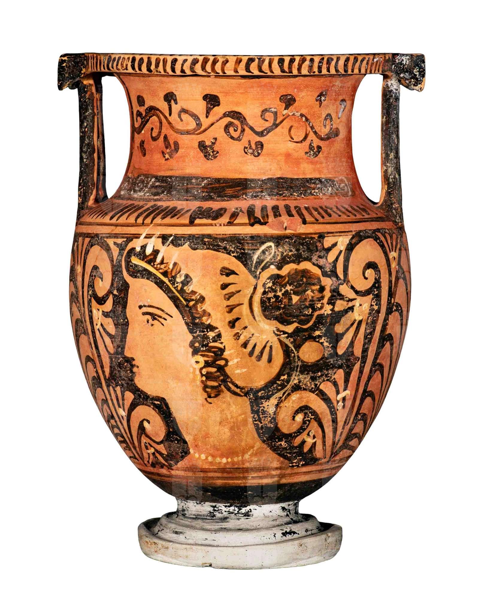 Cratere a colonnette apulo a figure rosse. Sul collo serto d'edera nero su fondo rosso. Lato A e B: testa femminile con mitella tra palmette.