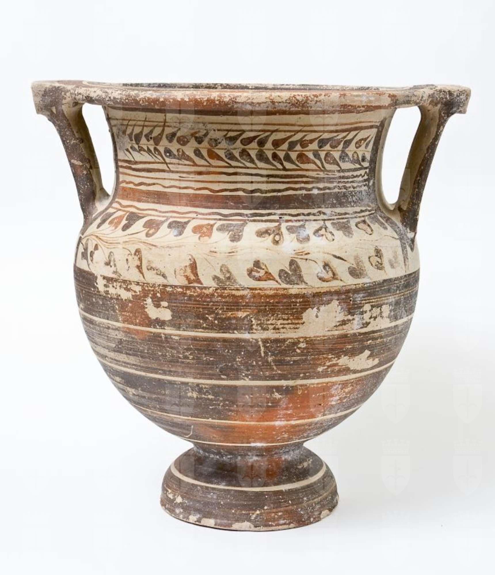 Cratere a colonnette tornito a fasce e di stile misto. Orlo a fascia e modanatura concava, nel quale confluiscono, tramite la piastra, le anse a colonnette; collo cilindrico a profilo concavo, corpo ovoidale con spalla tondeggiante, piede a echino. Decorazione a vernice monocroma rossa e brunastra su fondo naturale di argilla, con ramo d’ulivo e linee ondulate sul collo e un fregio di foglie d’edera sulla spalla, con ampie fasce parallele interamente campite a vernice rossastra sul ventre; campitura rossastra nell’orlo, nelle anse e nel piede.